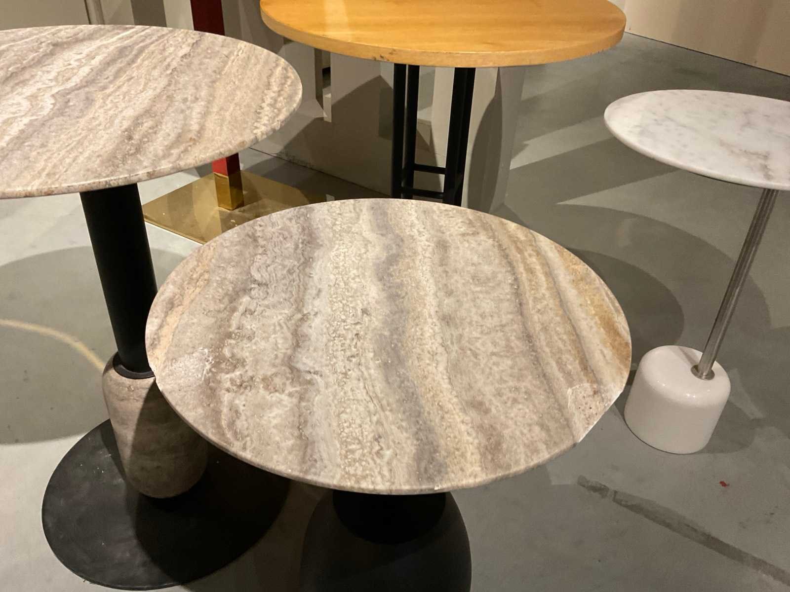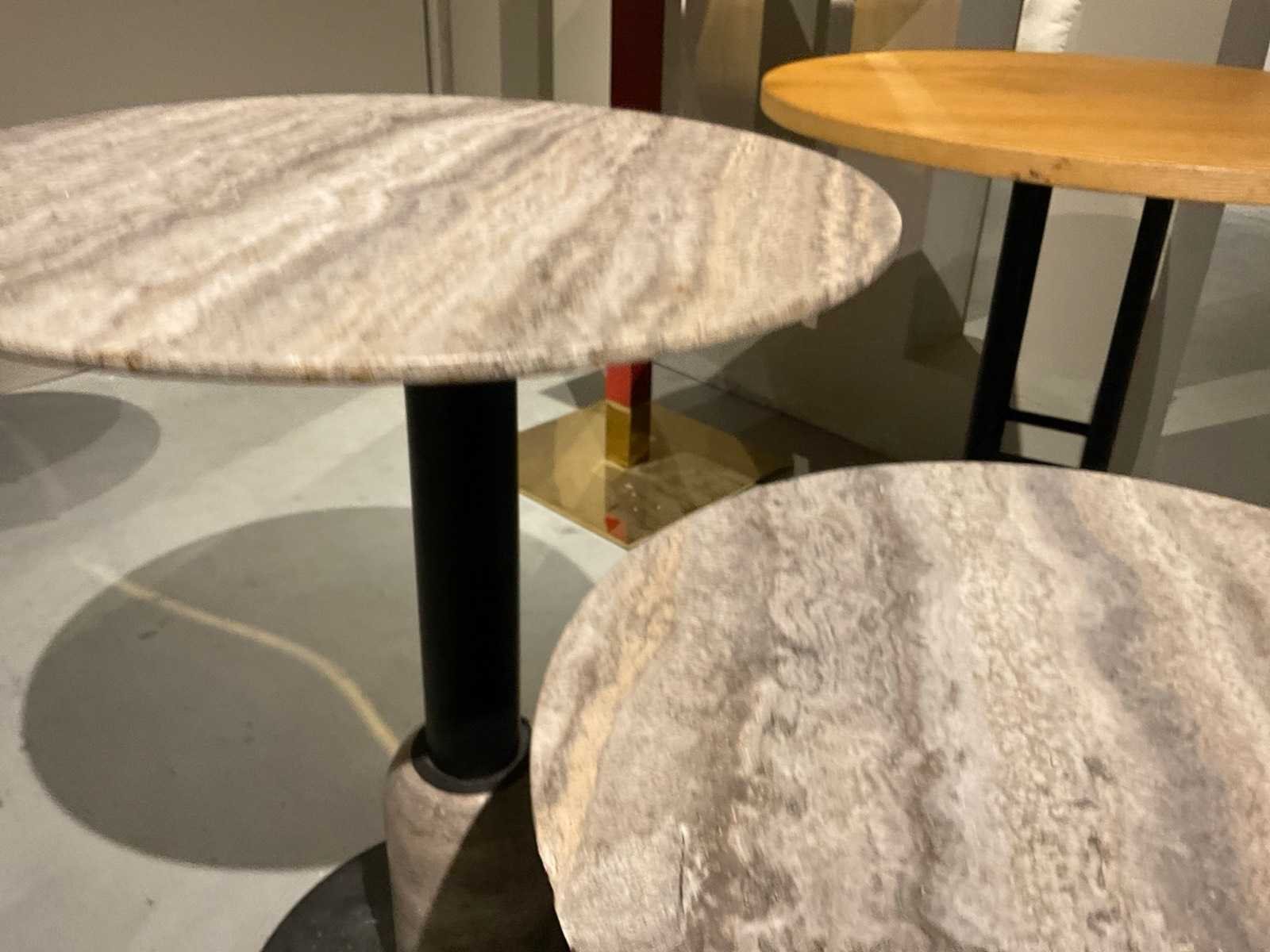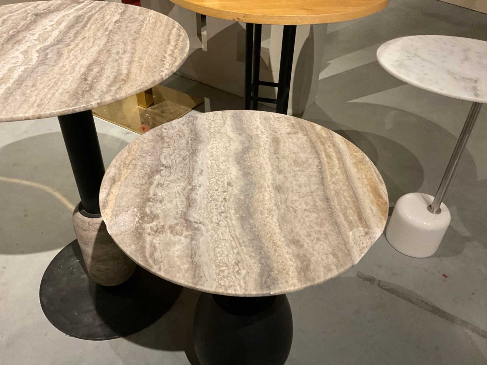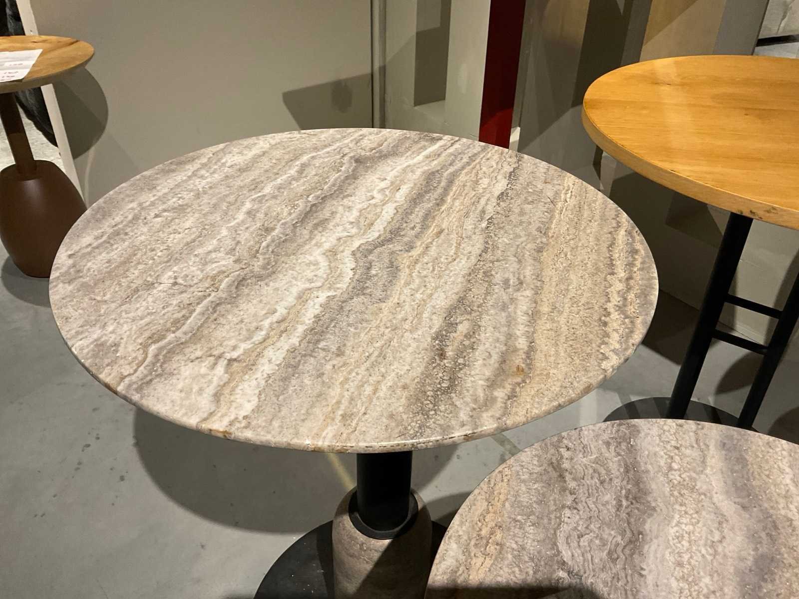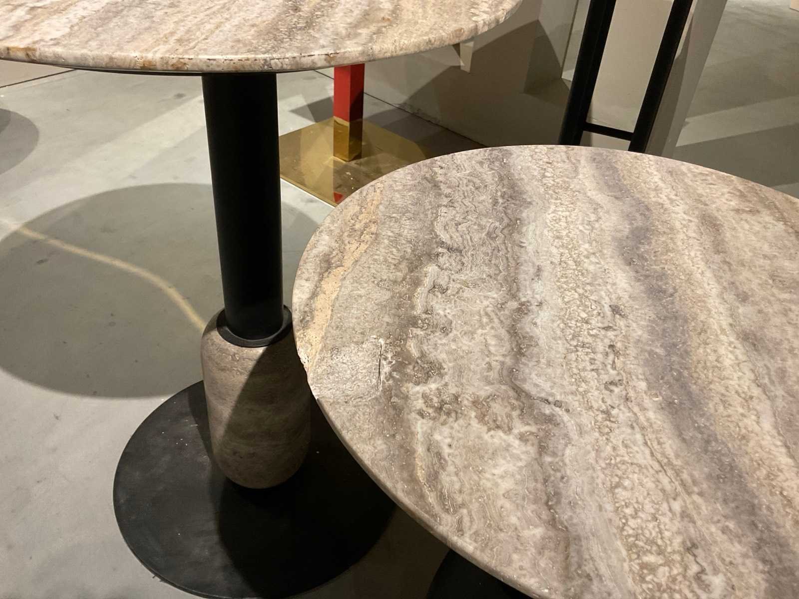 Blad is beschadigd zie foto’s Afmetingen linker tafel. (LxBxH) 60x60x76 cm Afmetingen rechter tafel (LxBxH) 50x50x62 cm Model: Bulli