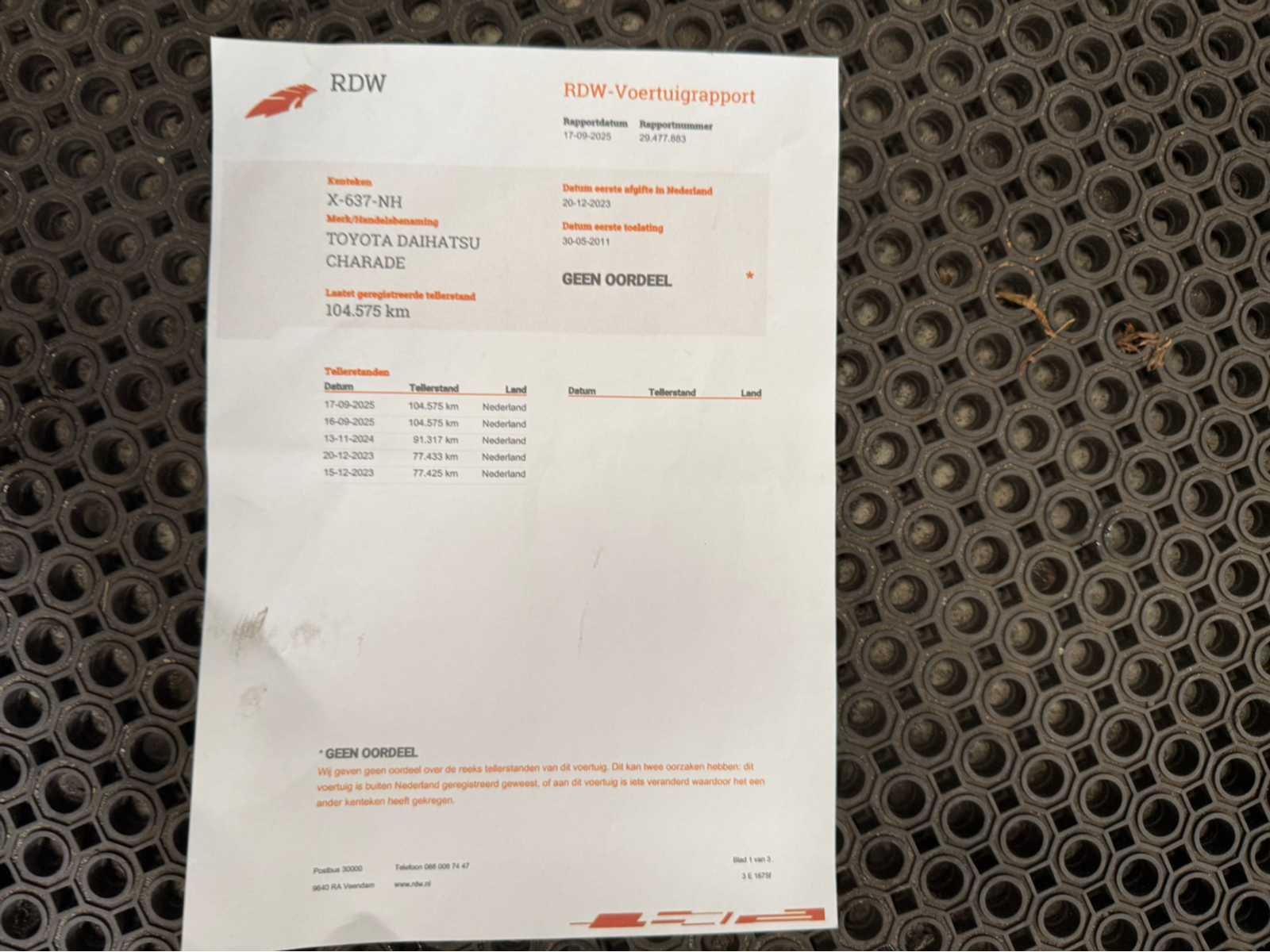 Kenteken: X-637-NH Merk: Toyota Model: Charade Type: Charade Bouwjaar: 2011 Afgelezen kilometerstand: 104580km Cilinderinhoud: 1329cc Vermogen (kW): 73kW Brandstof: benzine Laadvermogen: 0kg NAP status: Geen oordeel Datum eerste toelating: 2011-05-30 Datum eerste toelating (NL): 2023-12-20 APK vervaldatum: 2025-12-20 Vermogen (pk): 99hp Aantal zitplaatsen: 5 Maximaal trekgewicht ongeremd: 550kg Maximaal trekgewicht geremd: 900kg Kleur: rood Transmissie: Handgeschakeld Emissieklasse: 5 Aantal deuren: 4 Ledig gewicht: 1025kg Bruto BPM (NL): 452€ Rest BPM: 35€ Aantal cilinders: 4 Carrosserie: mpv Nationaliteit documenten: Nederlands Carfax Link: https://was.carfax.eu/v0/api/ccdid/5100016408/svc/201/vinreg/X637NH/checksum/eyJhbGciOiJIUzI1NiIsInR5cCI6IkpXVCJ9.eyJleHAiOjE3NjUxMjg1NDB9.mmwwxnbC4lEVs6GxT1hGCiQDfhwsK0jJvWu8h7LnwFw Start en rijdt: Ja Self drive export possible : true