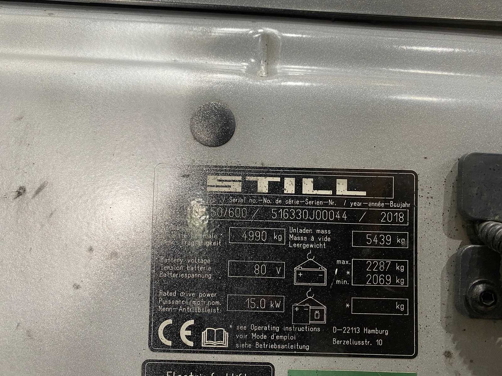 Bouwjaar batterij 2021 Non marking banden Merk: Still Type: RX60-50/600 Bouwjaar: 2018 Serienummer: 516330J00044 Brandstof: Elektrisch Mast: Duplex Soort band: Vol rubber Aantal wielen: 4 Afgelezen urenstand: 1265 Accu lader: true Side-shift: true Hydraulisch verstelbare lepels: true Duplex mast: true Eigen gewicht: 7726kg Hefvermogen: 5000kg Lepellengte: 1200mm Hefhoogte: 4000mm Vol rubber banden: true Minimale doorrijhoogte: 2800mm Totale afmeting L: 3000mm Totale afmeting Breedte: 1400mm Totale afmeting Hoogte: 2800mm