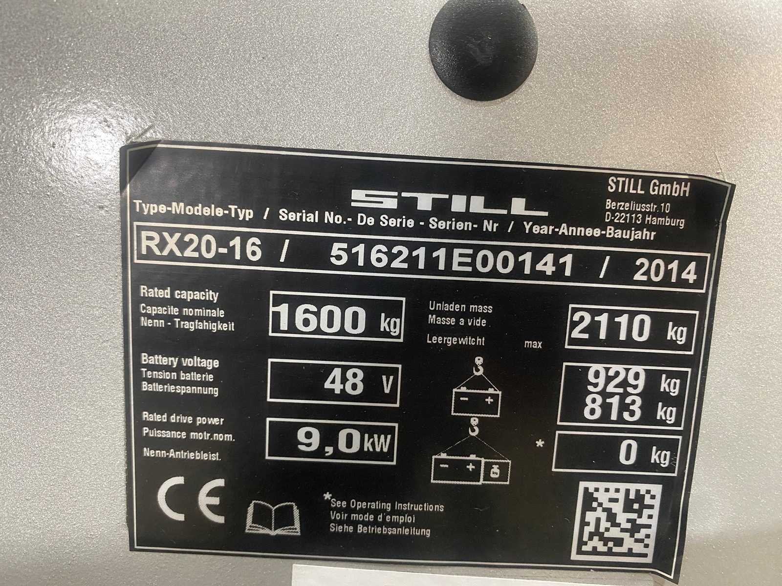 Merk: Still Type: RX20-16 Bouwjaar: 2014 Serienummer: 516211E00141 Brandstof: Elektrisch Mast: Duplex Soort band: Volrubber Aantal wielen: 3 Afgelezen urenstand: 7783 Accu lader: true Free-lift: true Side-shift: true Hydraulisch verstelbare lepels: true Duplex mast: true Eigen gewicht: 3039kg Hefvermogen: 1600kg Lepellengte: 1200mm Hefhoogte: 3630mm Vol rubber banden: true Minimale doorrijhoogte: 2260mm Totale afmeting L: 1900mm Totale afmeting Breedte: 1150mm Totale afmeting Hoogte: 2260mm