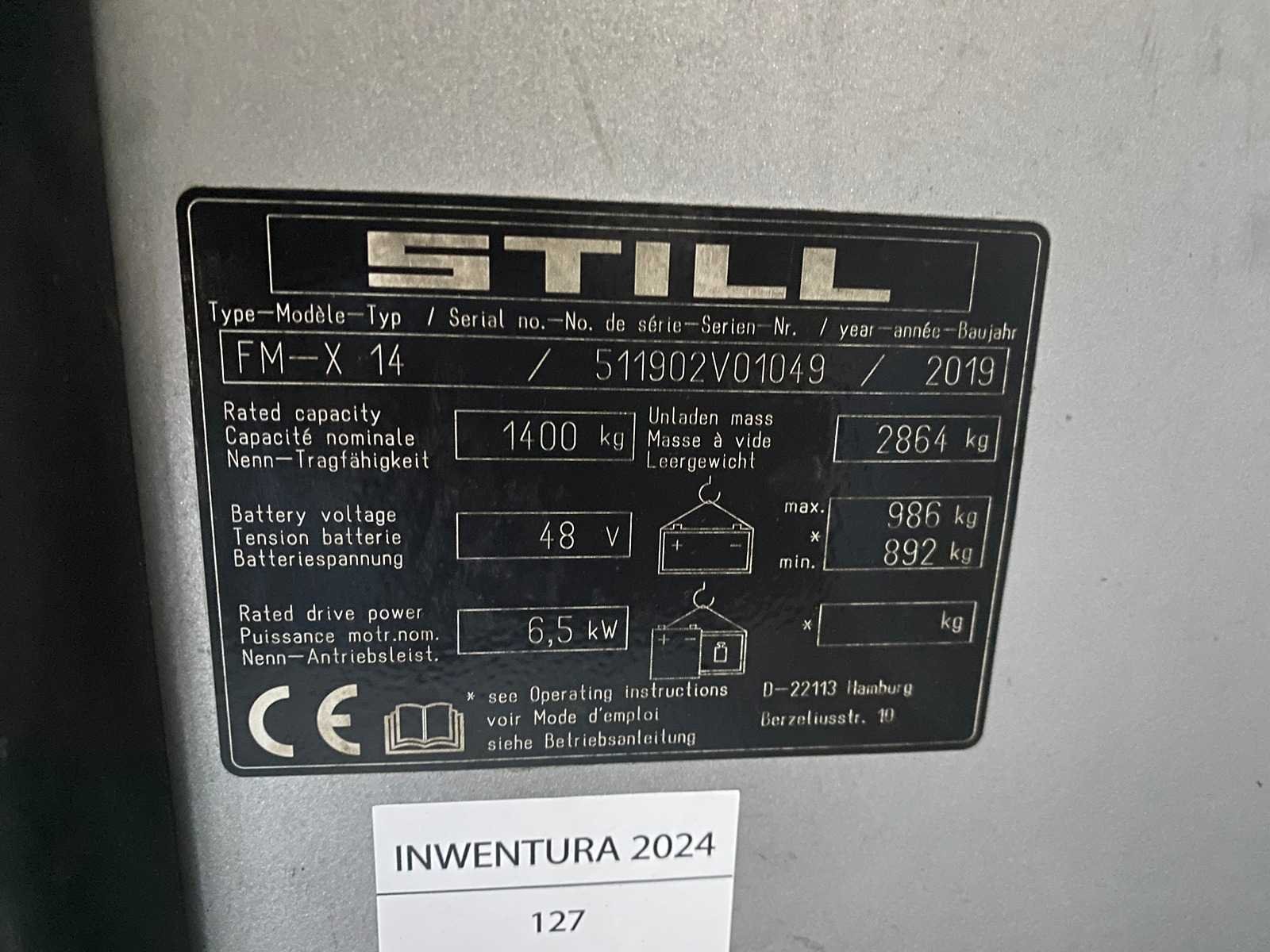 Merk: Still Type: FM-X14 Bouwjaar: 2019 Serienummer: 511902V01049 Brandstof: Elektrisch Mast: Triplex mast Soort band: volrubber Aantal wielen: 3 Afgelezen urenstand: 10646 Accu lader: true Free-lift: true Side-shift: true Triple mast: true Eigen gewicht: 3850kg Hefvermogen: 1400kg Lepellengte: 1200mm Hefhoogte: 8900mm Minimale doorrijhoogte: 3500mm Totale afmeting L: 1900mm Totale afmeting Breedte: 1270mm Totale afmeting Hoogte: 3500mm Elektrisch: true Vol rubber banden: true