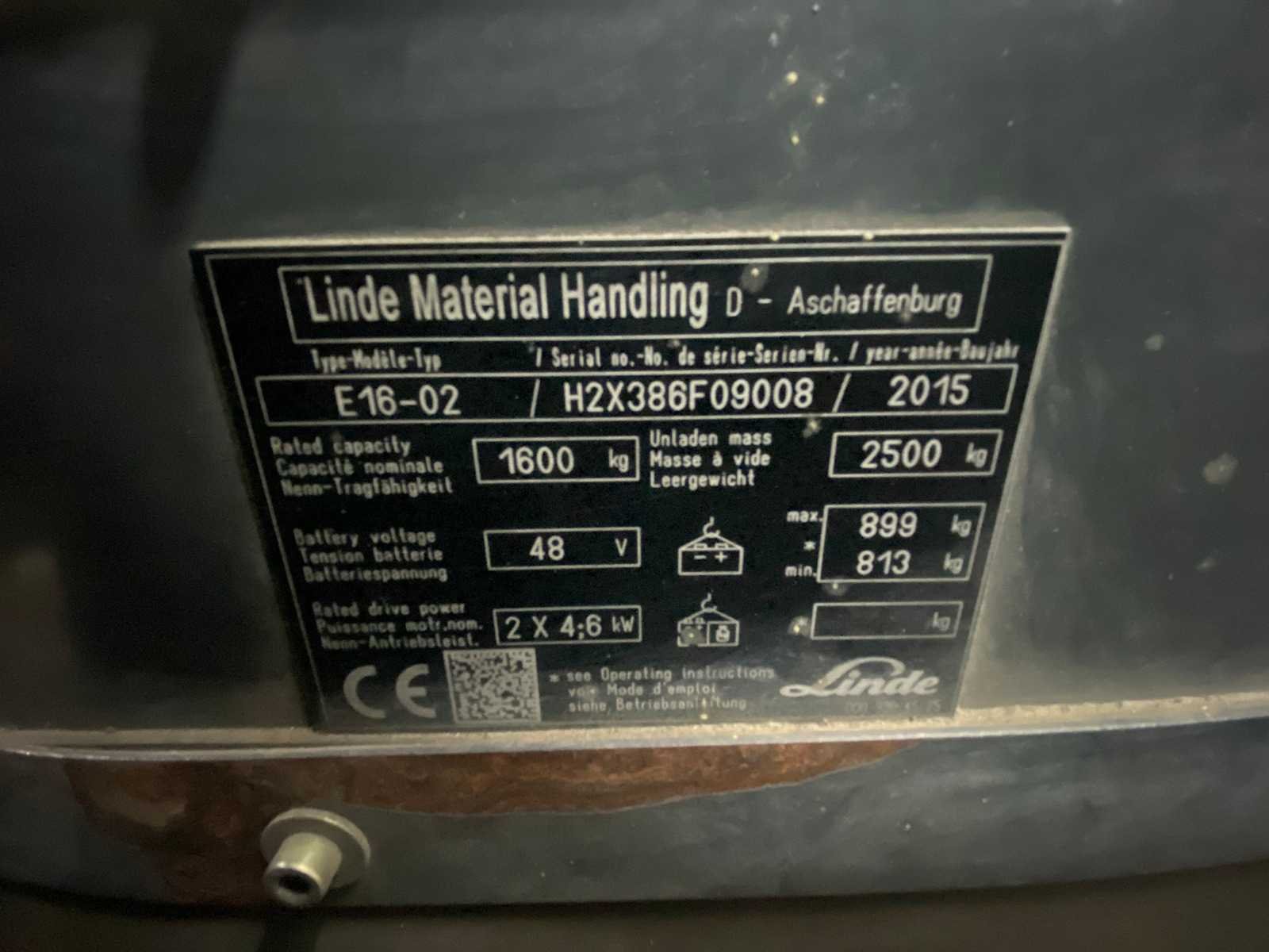 Merk: Linde Type: E16-02 Bouwjaar: 2015 Serienummer: H2X386F09008 Brandstof: Elektrisch Mast: Triplex Soort band: Volrubber Aantal wielen: 3 Afgelezen urenstand: 9262 Accu lader: true Free-lift: true Side-shift: true Hydraulisch verstelbare lepels: true Triple mast: true Eigen gewicht: 4399kg Hefvermogen: 1600kg Lepellengte: 1200mm Hefhoogte: 6080mm Vol rubber banden: true Minimale doorrijhoogte: 2660mm Totale afmeting L: 1950mm Totale afmeting Breedte: 1150mm Totale afmeting Hoogte: 2660mm