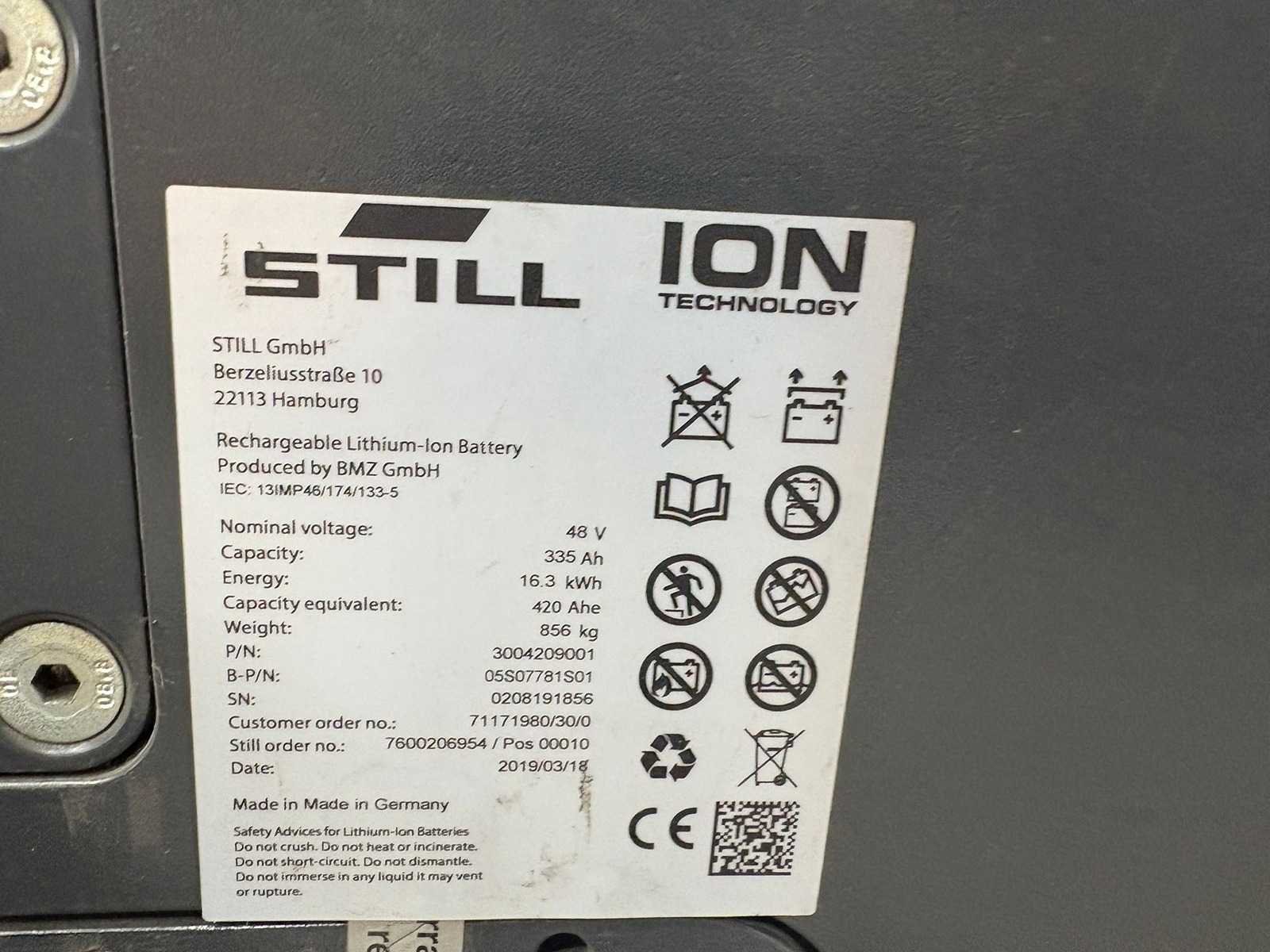 Merk: Still Type: Lithium Bouwjaar: 2019 Serienummer: 0208191856 Afmeting l: 83cm Afmeting b: 63cm Afmeting h: 83cm Eigen gewicht: 856kg