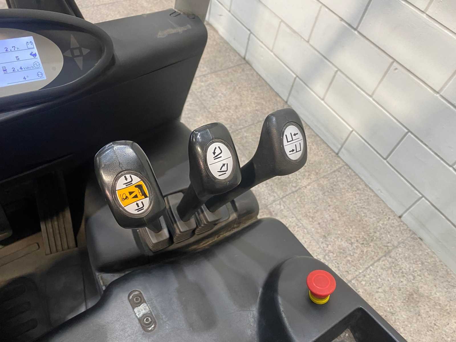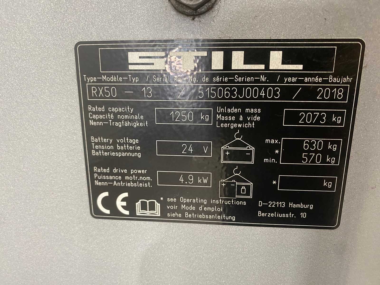 Merk: Still Type: RX50-13 Bouwjaar: 2018 Serienummer: 7396375 Brandstof: Elektrisch Mast: Duplex Soort band: Volrubber Aantal wielen: 3 Afgelezen urenstand: 3356 Accu lader: true Side-shift: true Duplex mast: true Eigen gewicht: 2703kg Hefvermogen: 1300kg Lepellengte: 1200mm Hefhoogte: 3300mm Vol rubber banden: true Minimale doorrijhoogte: 2100mm Totale afmeting L: 1800mm Totale afmeting Breedte: 1000mm Totale afmeting Hoogte: 2100mm