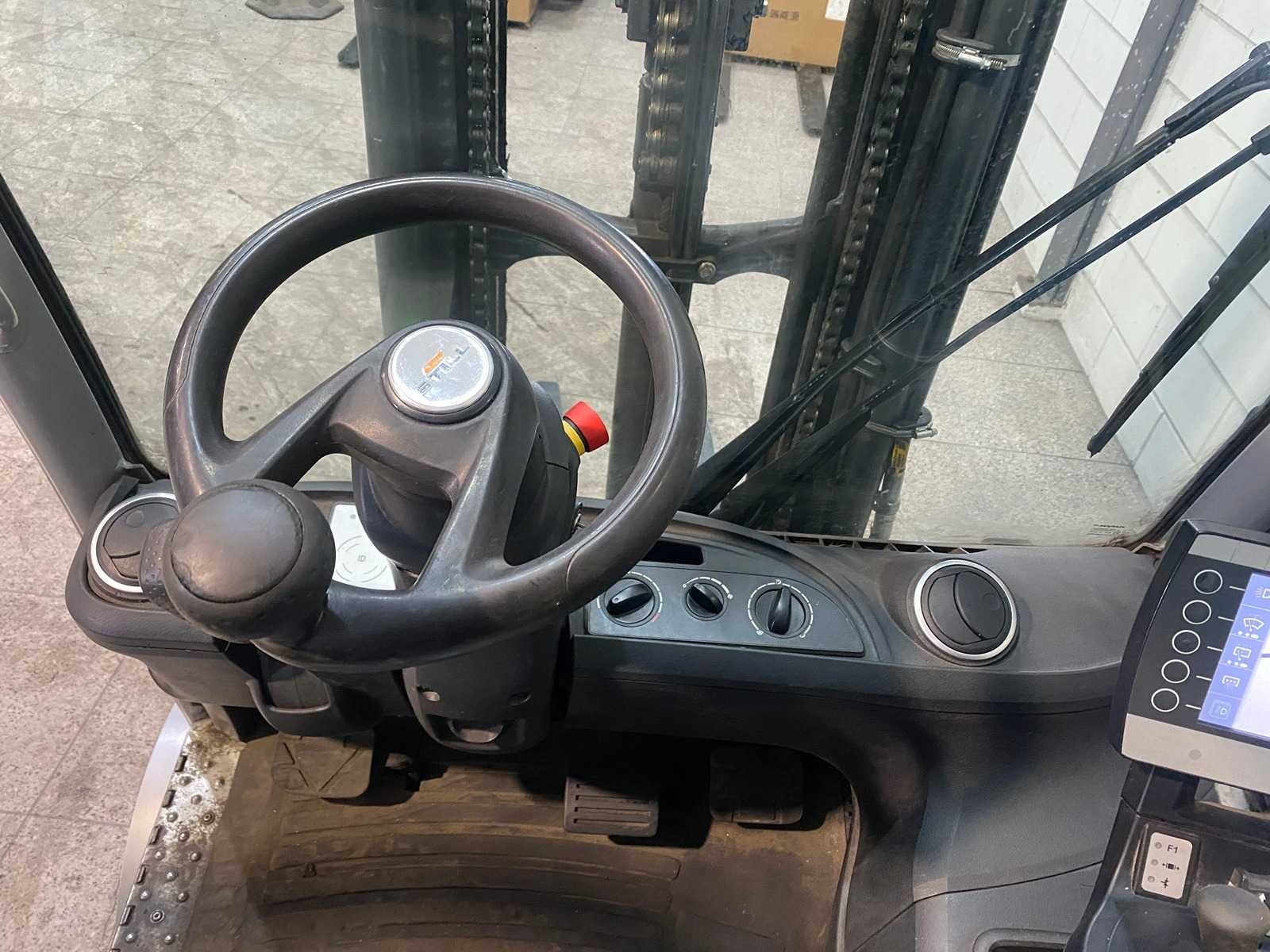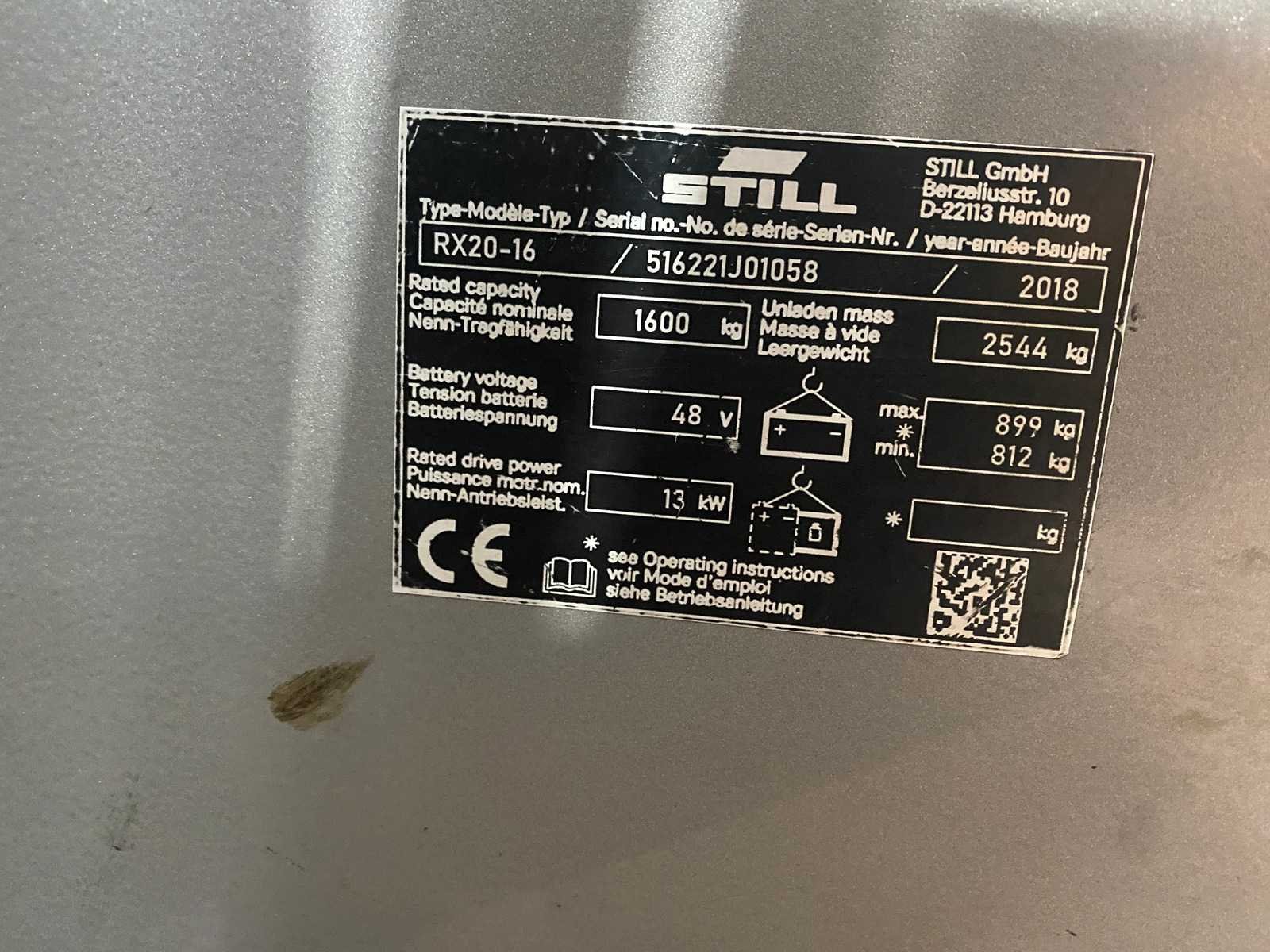 Merk: Still Type: RX20-16 Bouwjaar: 2018 Serienummer: 516221J01058 Brandstof: Elektrisch Mast: Triplex Soort band: Volrubber Aantal wielen: 3 Afgelezen urenstand: 15894 Accu lader: true Free-lift: true Side-shift: true Triple mast: true Eigen gewicht: 3443kg Hefvermogen: 1600kg Lepellengte: 1000mm Hefhoogte: 5600mm Vol rubber banden: true Minimale doorrijhoogte: 2430mm Totale afmeting L: 1900mm Totale afmeting Breedte: 1150mm Totale afmeting Hoogte: 2430mm