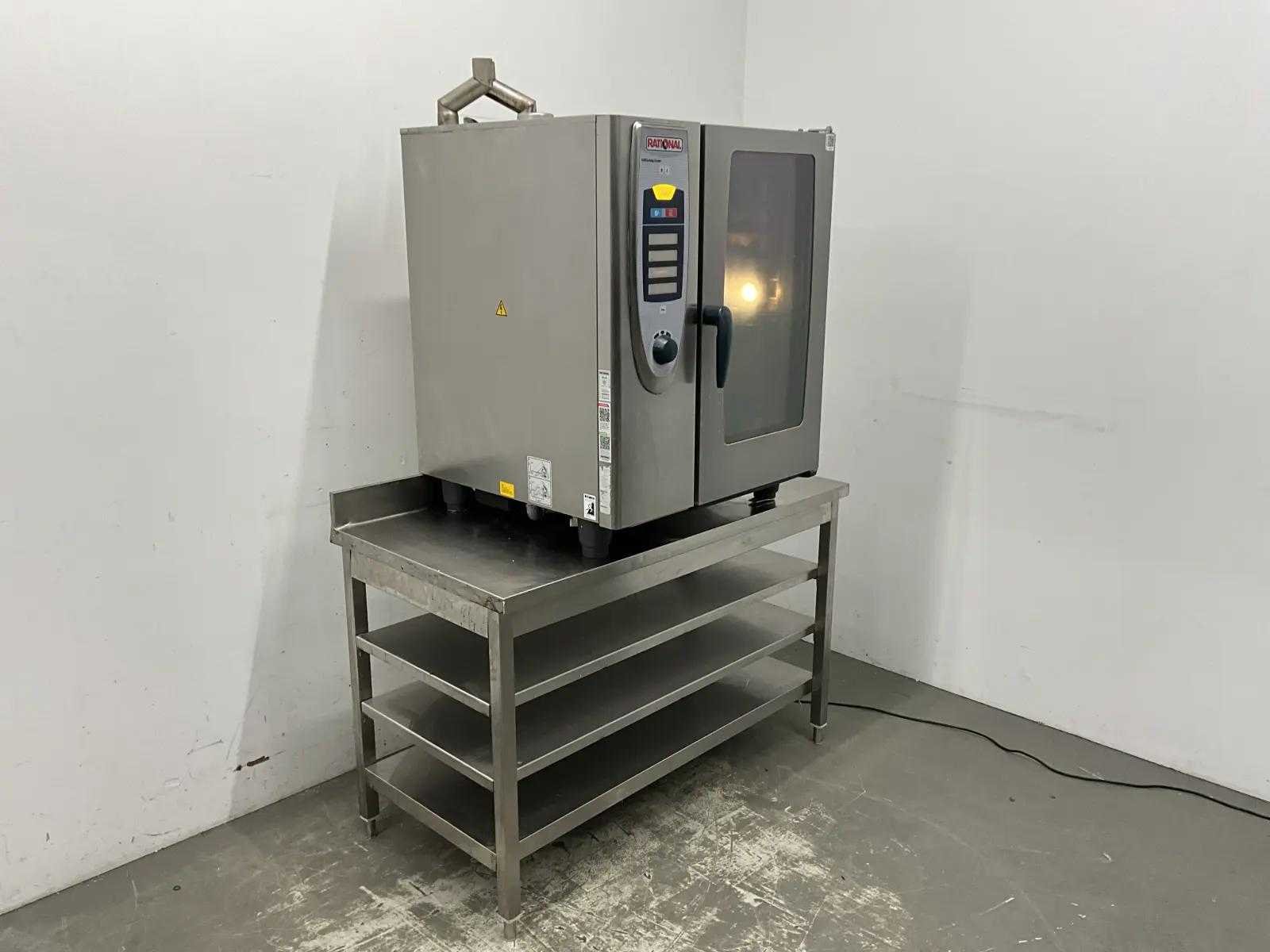 Incl. werktafel (140x70x90 cm). Aansluiting: Gas. Merk: Rational Type: SCC 101G Totale afmeting L: 85cm Totale afmeting Breedte: 80cm Totale afmeting Hoogte: 116cm
