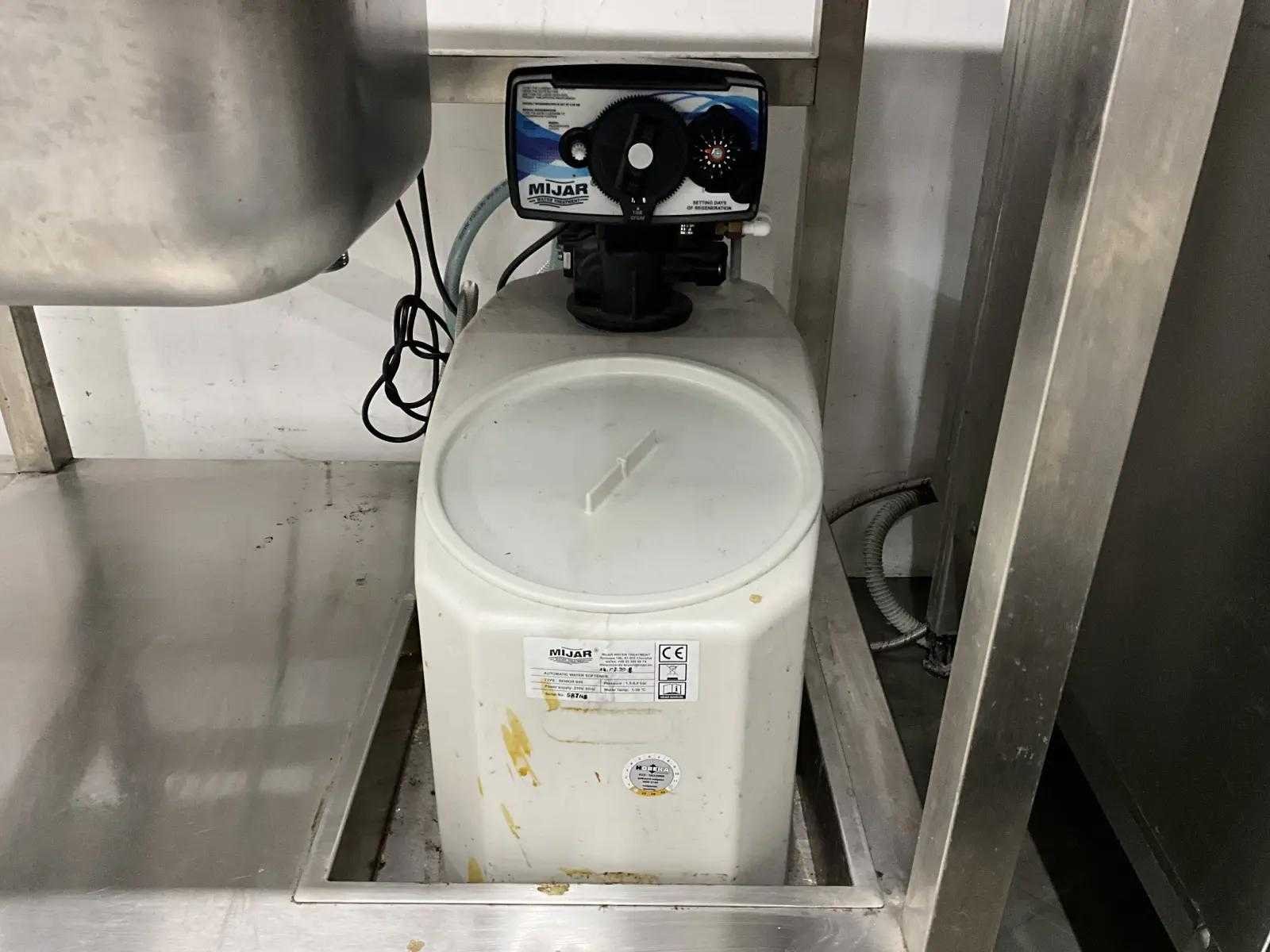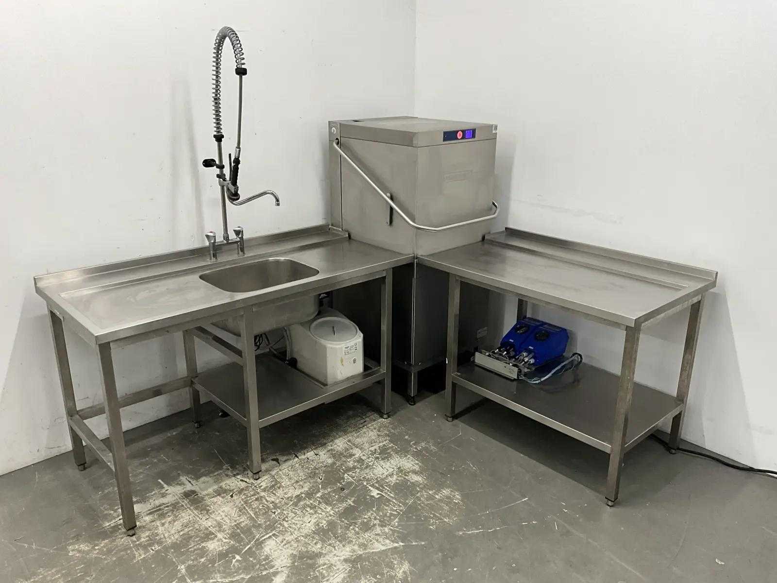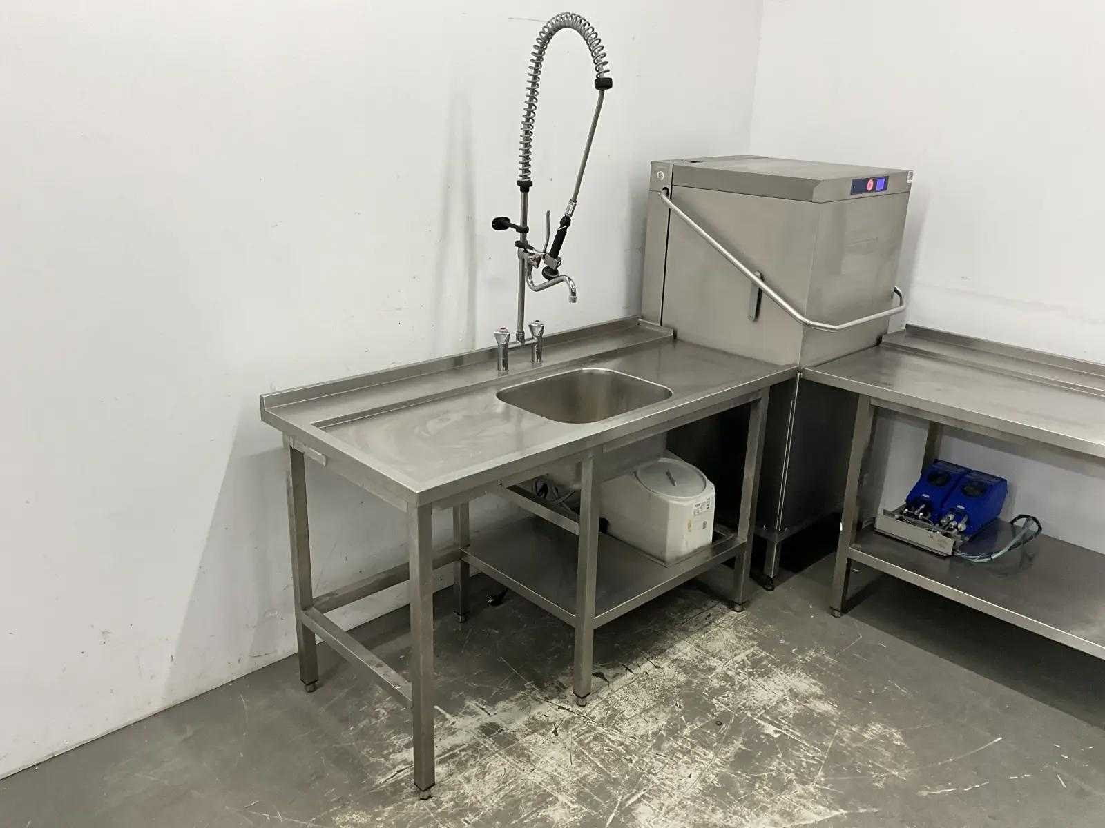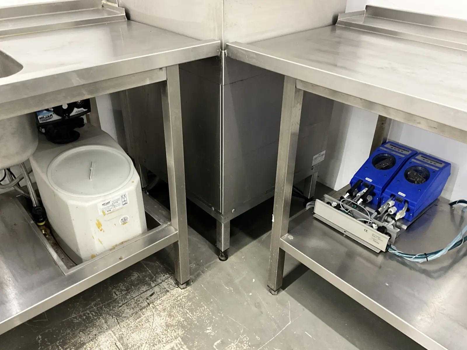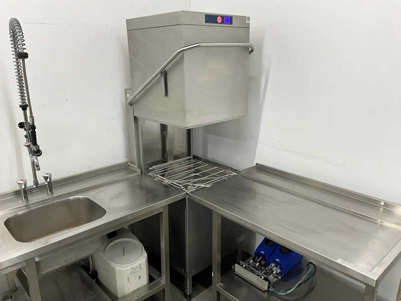 Complete spoelkeuken v.v. korven spoeltafel met mengkraan en voorspoeldouche (160x75x90 cm), korven afvoertafel (120x750x90 cm), waterontharder (Mijar Senior B65) en zeepdoseersysteem Suma Merk: Hobart Type: AMX-10A Vermogen: 7.1kW Aansluiting: 400V Totale afmeting L: 640mm Totale afmeting Breedte: 730mm Lengte: 640 Totale afmeting Hoogte: 1530mm