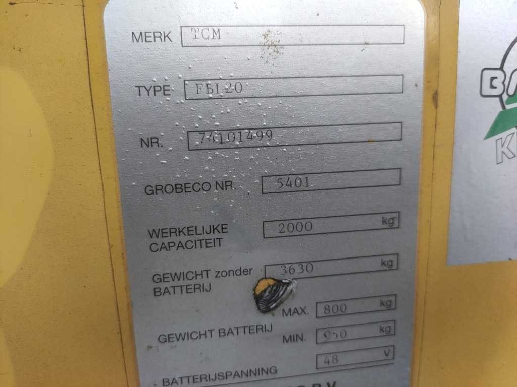 Merk: TCM Type: FBL20 Mast: doorkijkmast Afgelezen urenstand: 4098 Accu lader: true Hefvermogen: 2000kg