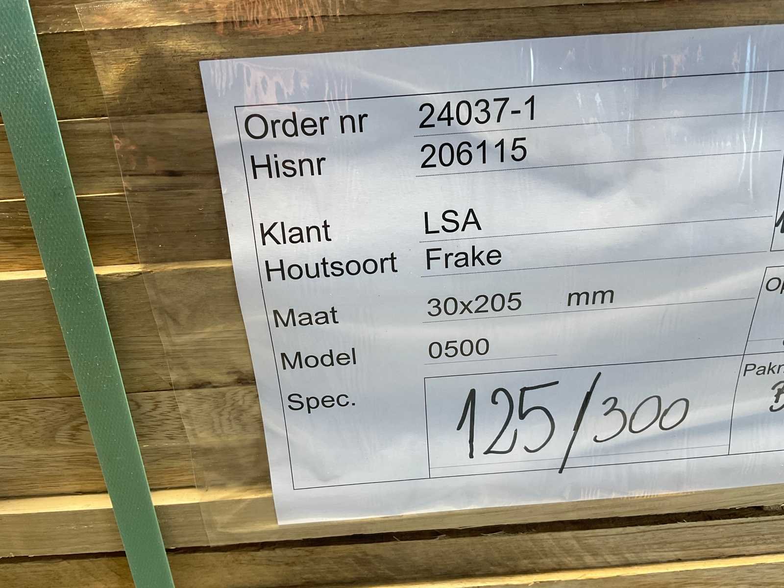 Fraké-houten planken met een afmeting van 300 x 20,5 x 3 cm. Lengte: 3000mm Breedte: 205mm Hoogte: 30mm Materiaal: Fraké hout