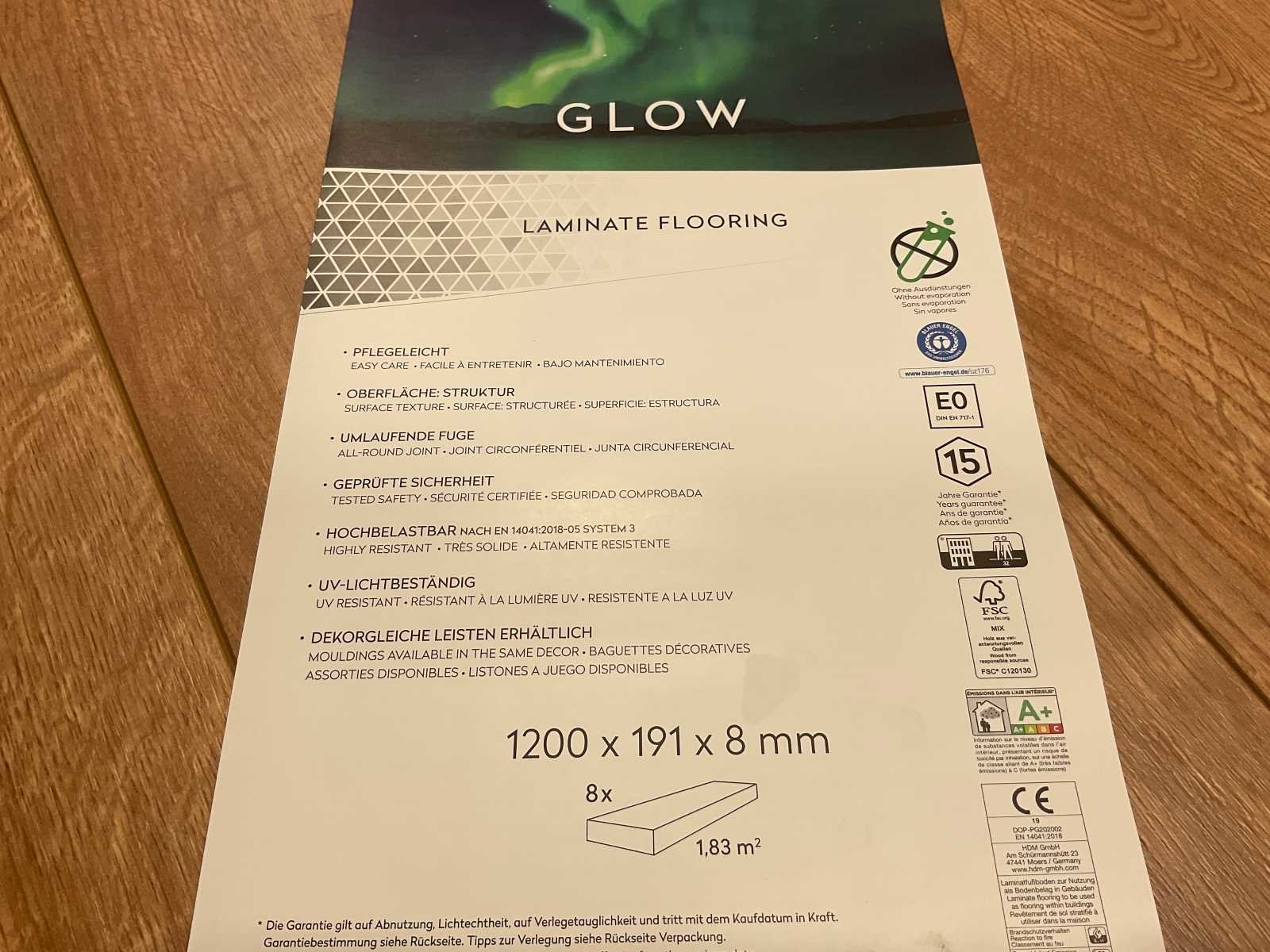 Glow Mediterraan Eiken laminaat van het merk Purity à 1,83m² per pak = totaal van 1,83m². Merk: Purity Model: Glow Product type: Laminaat Oppervlakte: 1.83m² Geschikt voor vloerverwarming: true V-groef: true Aantal m² per verpakking: 1.83m² Kleur: Mediterraan Eiken Gewicht: 13.2kg Lengte: 1200mm Breedte: 191mm Hoogte: 8mm Materiaal: HDF