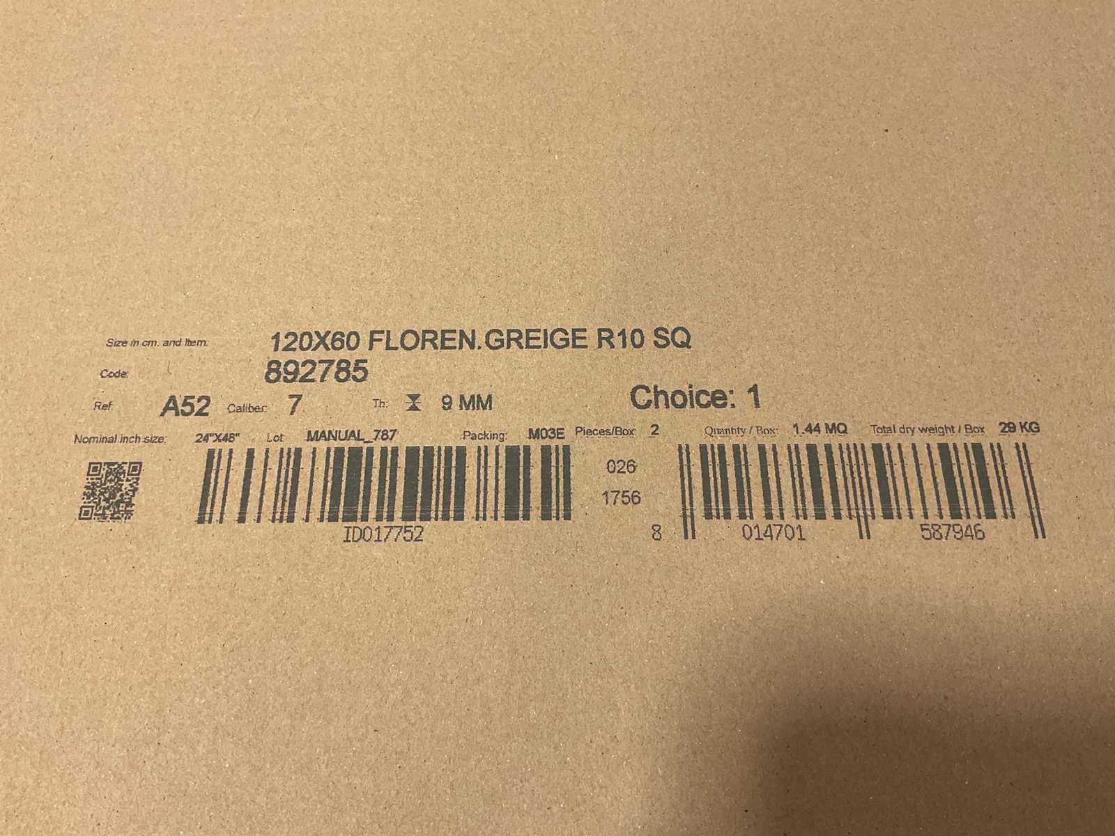 Keramische tegels van het merk Iris Ceramica, type Florence, in de kleur Greige. Deze tegels zijn geschikt voor vloer- en wandtoepassing en hebben een formaat van 120 x 60 cm met een dikte van 9 mm. Per pak zitten 2 tegels, goed voor een oppervlakte van 1,44 m². Merk: Iris Ceramica Kleur: Greige Lengte: 1200mm Breedte: 600mm Dikte: 9mm Materiaal: Keramiek Type: tegels Model: wand/vloer Gewicht: 14,5kg Style: Florence Aantal m² per verpakking: 1,44m² Aantal pakken: 1 Totaal oppervlakte: 1,44m² Totaal gewicht: 29kg