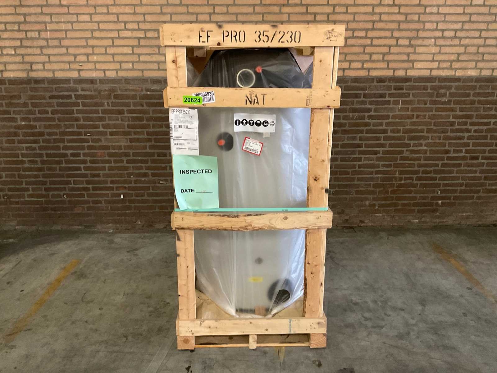 Technische Specificaties: Nominaal Vermogen (kW): 35,1 Nominale Belasting (Hi) kW: 32,9 Nominale Belasting (Hs) kW: 36,6 Rendement (bovenwaarde): 96% Gascategorie: I 2L, I2H, I3p Gasvoordruk (mbar): 20/25/37 Gaspiekverbruik (m3/uur): 4,04 Rookgasdiameter (concentrisch, mm): 100/150 Emissies van Stikstofoxiden (NOx mg/kWh): 44 Elektrische Aansluiting (Volt/Hz): 230/50-60 Instelbare Watertemperatuur (°C): 32 - 82 Waterbedrijfsdruk (min. - max. bar): 1,0 - 10,0 Afmetingen (h x b x d, mm): 1448 x 718 x 718 Montagegewicht (kg): 242 Volume Tank (liters): 227 Tapcapaciteit (l/uur): Continu (80°C): 430 Continu (65°C): 550 Continu (60°C): 600 Continu (40°C): 1010 1e Uur (65°C): 710 1e Uur (60°C): 760 1e Uur (40°C): 1170 Opwarmtijd (min): T=70°C: 33 T=55°C: 26 T=50°C: 23 T=30°C: 14 Model: EF PRO 35/230 Gewicht: 242kg Lengte: 71cm Breedte: 71cm Hoogte: 144cm