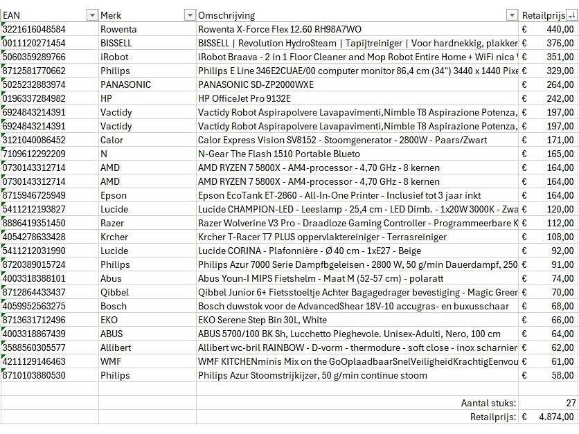 Dit betreft een partij A-merk retourgoederen van een grote online retailer. De partij bestaat uit diverse productcategorieën. Aantal stuks: 27. Retailwaarde: €4874,- Ongecontroleerd: werking onbekend (mix van werkend, incompleet, beschadigd, te gebruiken voor onderdelen). Kom op de kijkdag om te om zo een goed beeld te krijgen van de reden van retour. Zie foto's voor lijst met inhoud. Within 14 days Merk: Pallet Retourgoederen