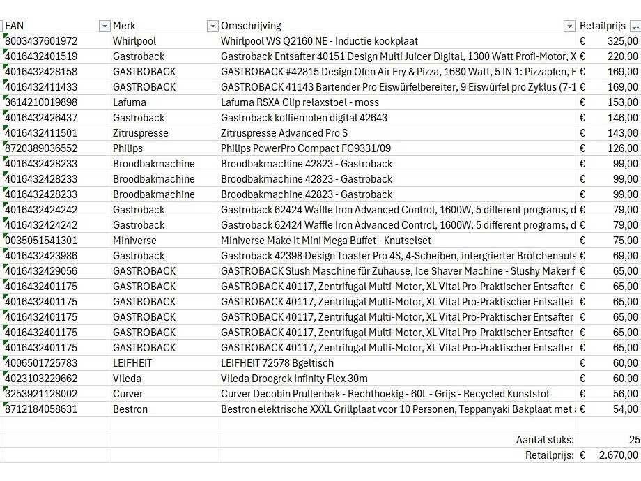 Dit betreft een partij A-merk retourgoederen van een grote online retailer. De partij bestaat uit diverse productcategorieën. Aantal stuks: 25. Retailwaarde: €2670,- Ongecontroleerd: werking onbekend (mix van werkend, incompleet, beschadigd, te gebruiken voor onderdelen). Kom op de kijkdag om te om zo een goed beeld te krijgen van de reden van retour. Zie foto's voor lijst met inhoud. Within 14 days Merk: Pallet Retourgoederen