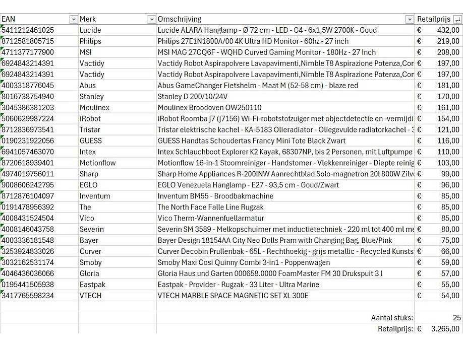 Dit betreft een partij A-merk retourgoederen van een grote online retailer. De partij bestaat uit diverse productcategorieën. Aantal stuks: 25. Retailwaarde: €3265,- Ongecontroleerd: werking onbekend (mix van werkend, incompleet, beschadigd, te gebruiken voor onderdelen). Kom op de kijkdag om te om zo een goed beeld te krijgen van de reden van retour. Zie foto's voor lijst met inhoud. Within 14 days Merk: Pallet Retourgoederen