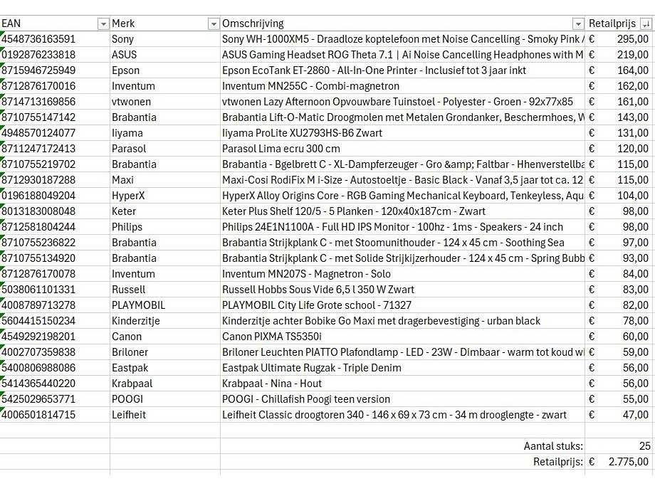 Dit betreft een partij A-merk retourgoederen van een grote online retailer. De partij bestaat uit diverse productcategorieën. Aantal stuks: 25. Retailwaarde: €2775,- Ongecontroleerd: werking onbekend (mix van werkend, incompleet, beschadigd, te gebruiken voor onderdelen). Kom op de kijkdag om te om zo een goed beeld te krijgen van de reden van retour. Zie foto's voor lijst met inhoud. Within 14 days Merk: Pallet Retourgoederen
