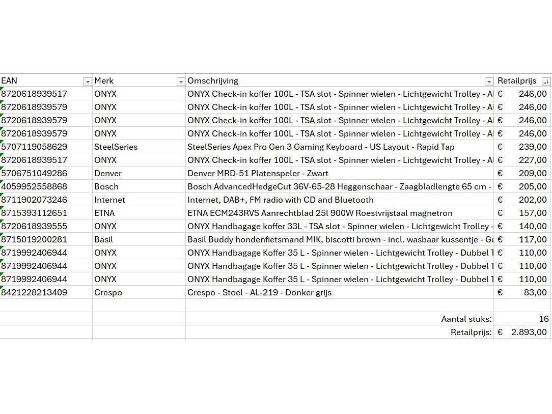 Dit betreft een partij A-merk retourgoederen van een grote online retailer. De partij bestaat uit diverse productcategorieën. Aantal stuks: 16. Retailwaarde: €2893,- Ongecontroleerd: werking onbekend (mix van werkend, incompleet, beschadigd, te gebruiken voor onderdelen). Kom op de kijkdag om te om zo een goed beeld te krijgen van de reden van retour. Zie foto's voor lijst met inhoud. Within 14 days Merk: Pallet Retourgoederen