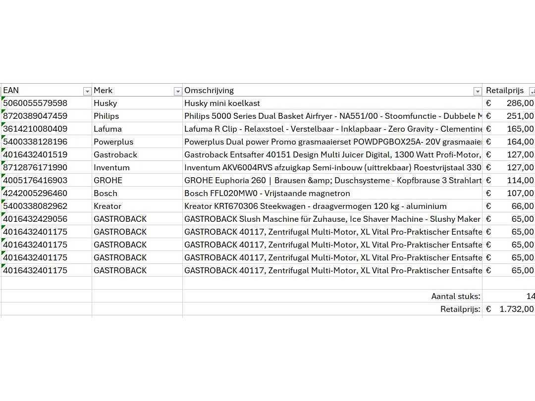 Dit betreft een partij A-merk retourgoederen van een grote online retailer. De partij bestaat uit diverse productcategorieën. Aantal stuks: 14. Retailwaarde: €1732,- Ongecontroleerd: werking onbekend (mix van werkend, incompleet, beschadigd, te gebruiken voor onderdelen). Kom op de kijkdag om te om zo een goed beeld te krijgen van de reden van retour. Zie foto's voor lijst met inhoud. Within 14 days Merk: Pallet Retourgoederen
