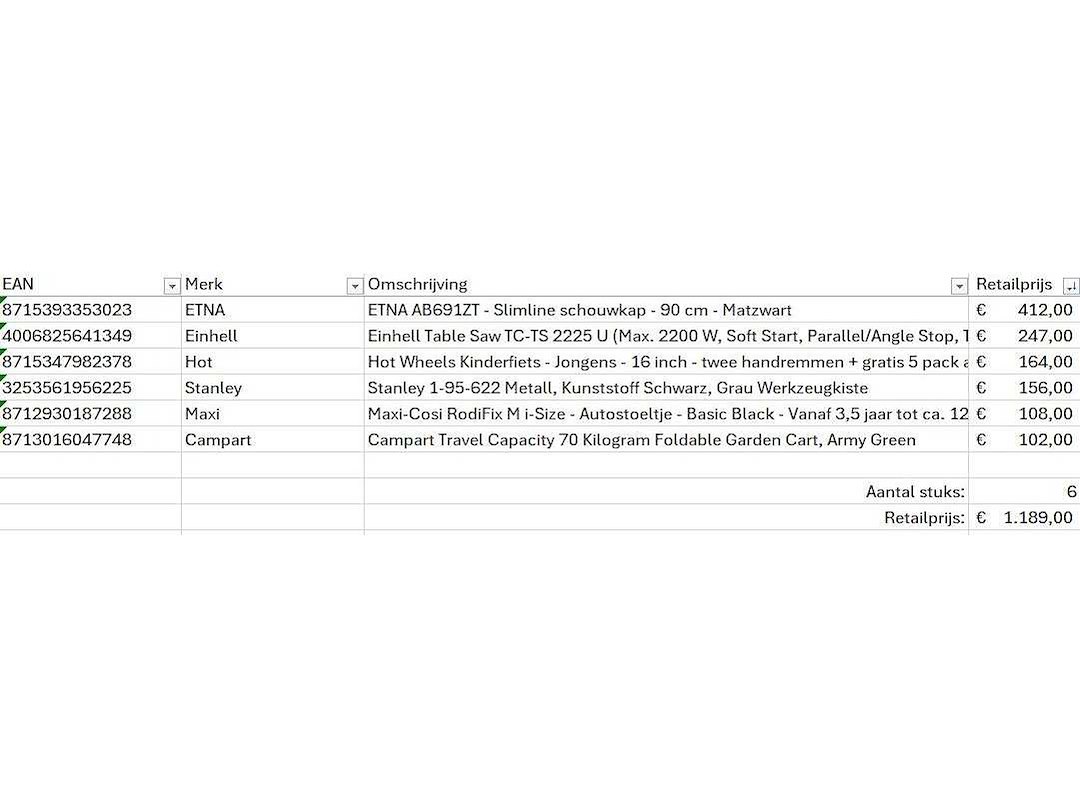 Dit betreft een partij A-merk retourgoederen van een grote online retailer. De partij bestaat uit diverse productcategorieën. Aantal stuks: 6. Retailwaarde: €1189,- Ongecontroleerd: werking onbekend (mix van werkend, incompleet, beschadigd, te gebruiken voor onderdelen). Kom op de kijkdag om te om zo een goed beeld te krijgen van de reden van retour. Zie foto's voor lijst met inhoud. Within 14 days Merk: Pallet Retourgoederen