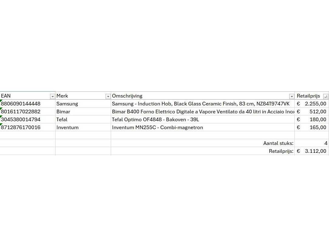 Dit betreft een partij A-merk retourgoederen van een grote online retailer. De partij bestaat uit diverse productcategorieën. Aantal stuks: 4. Retailwaarde: €3112,- Ongecontroleerd: werking onbekend (mix van werkend, incompleet, beschadigd, te gebruiken voor onderdelen). Kom op de kijkdag om te om zo een goed beeld te krijgen van de reden van retour. Zie foto's voor lijst met inhoud. Within 14 days Merk: Pallet Retourgoederen