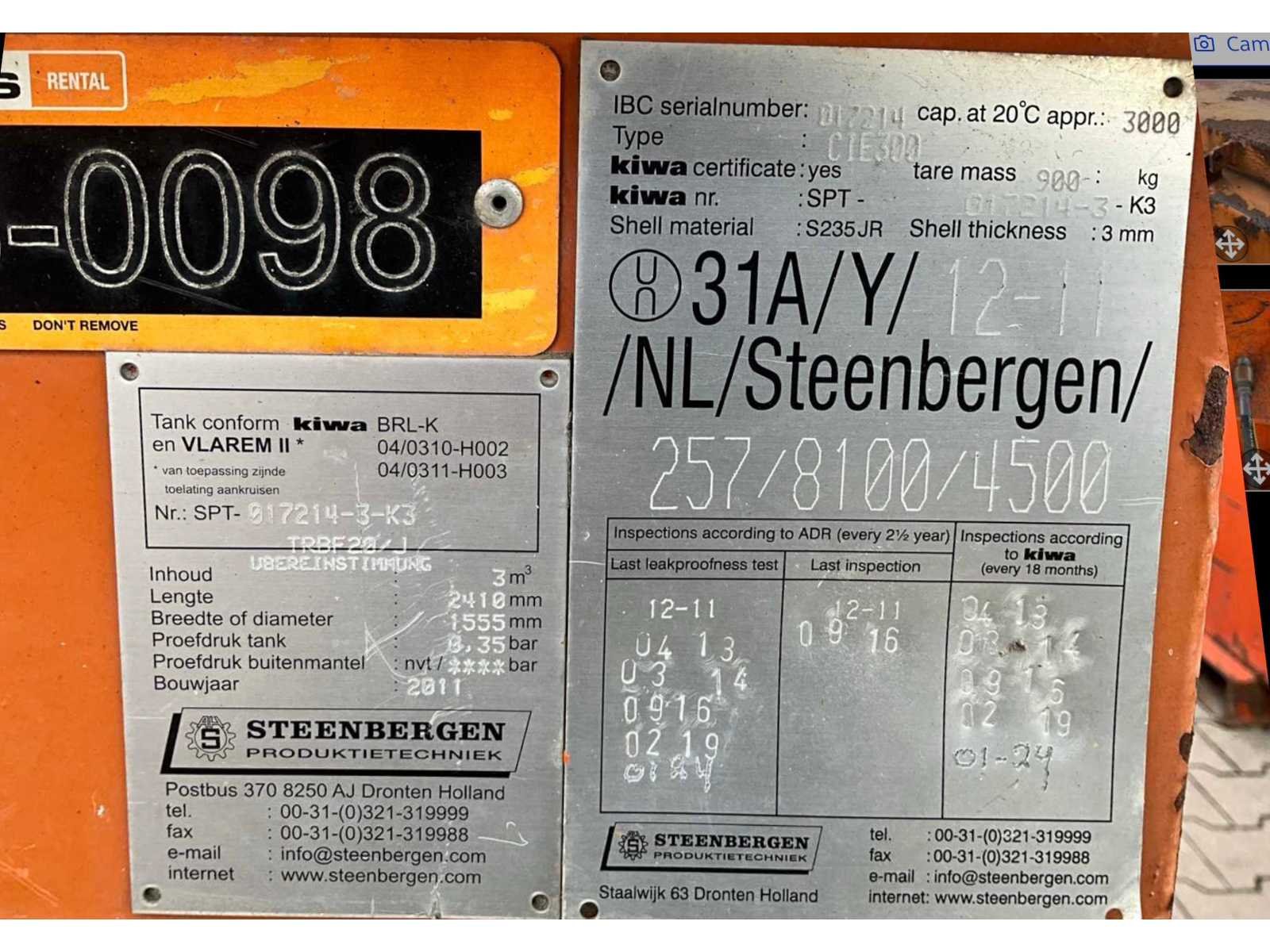 Wanddikte 3 mm; capaciteit 3000 liter; deksel; hijsogen; heftruck vorksleuven; snelkoppeling toe en afvoer; Merk: Steenbergen Gewicht: 900kg Type: CIE 300 Bouwjaar: 2011 Serienummer: 017214 Staal: true Mangat: true Dubbelwandig: true Totale afmeting L: 2450mm Totale afmeting Breedte: 1550mm Totale afmeting Hoogte: 1450mm