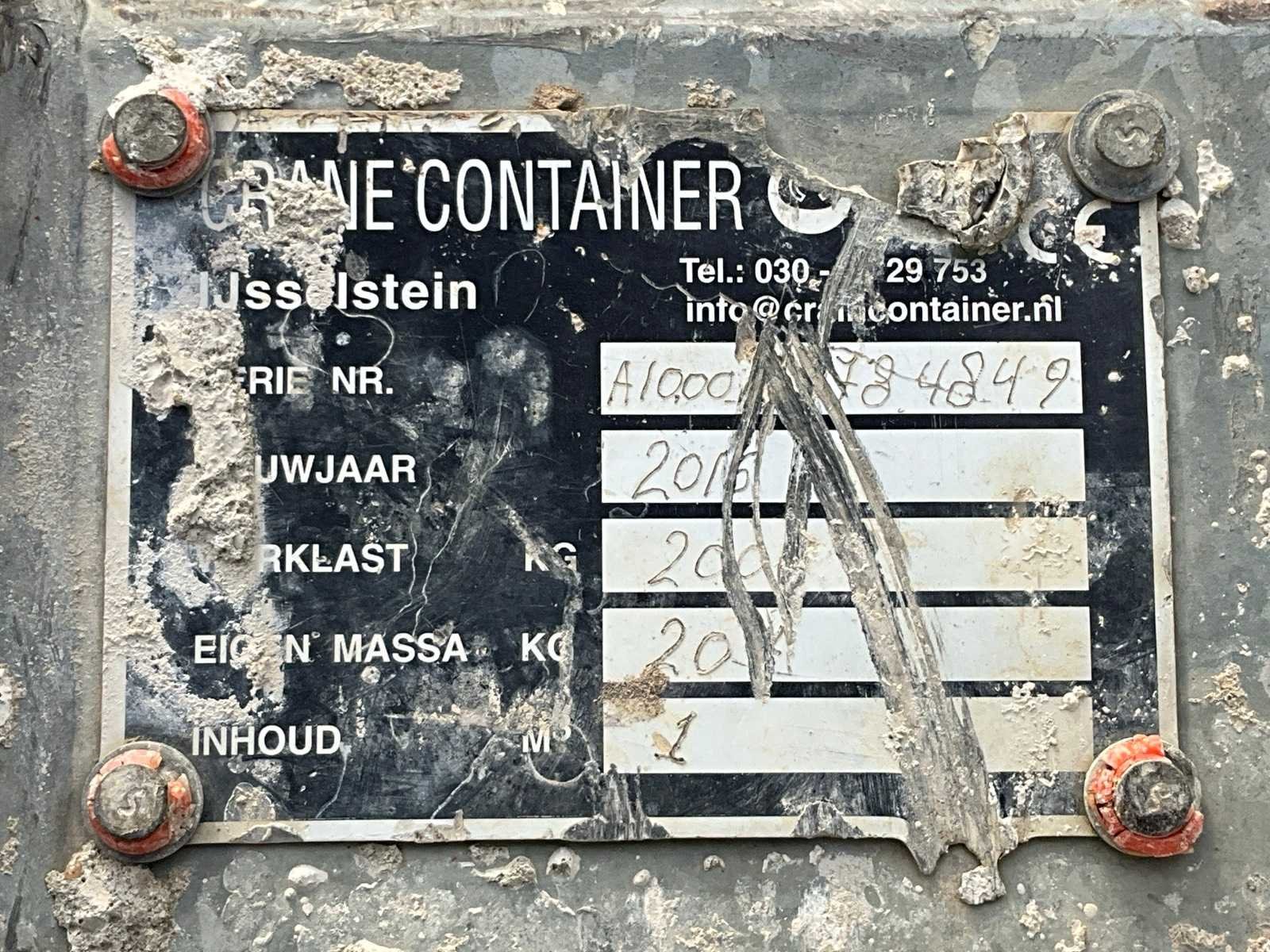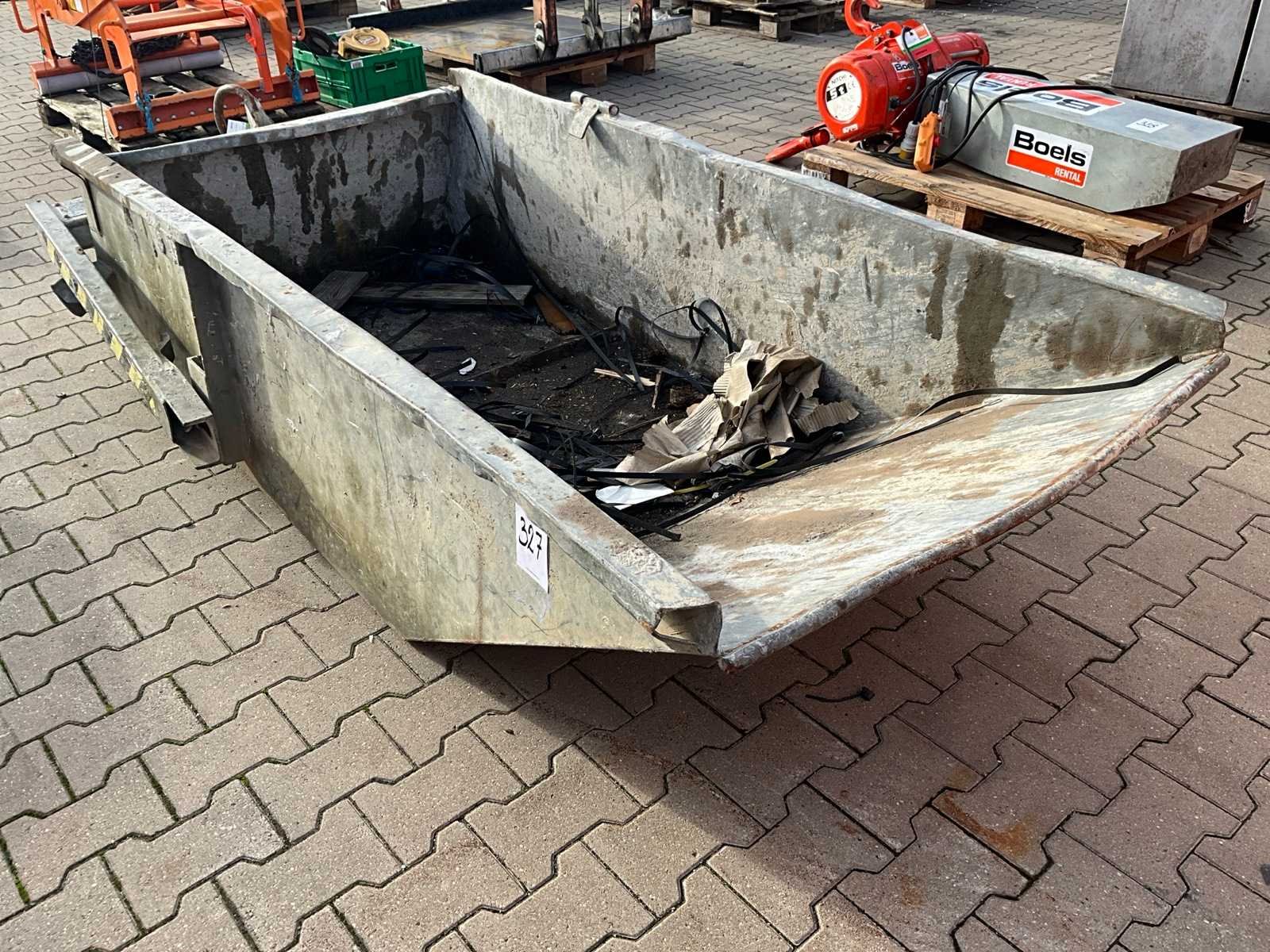 Gegalvaniseerd; neerklapbare hijsbeugel; inhoud 1000 liter; laadvermogen 2000 kg; gebruiksporen; Merk: Crane container Type: A Bouwjaar: 2015 Eigen gewicht: 210kg Totale afmeting L: 2300mm Totale afmeting Breedte: 1260mm Totale afmeting Hoogte: 560mm