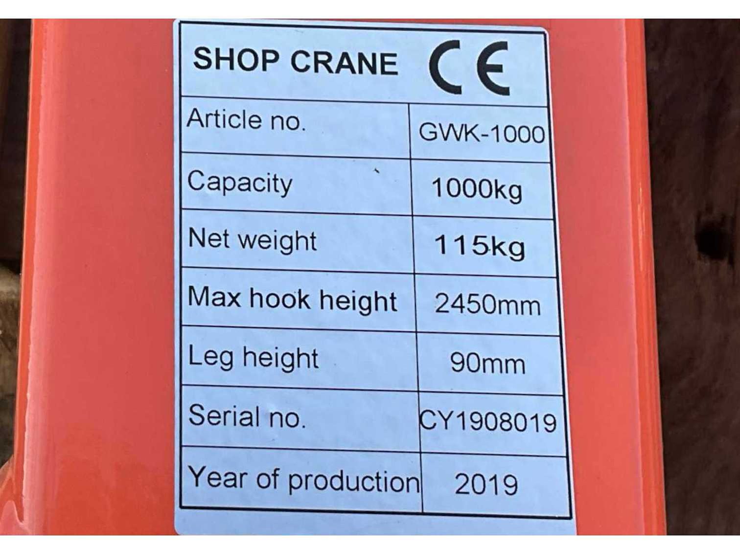 2019 shop crane gwk-1000 werkplaatskraan