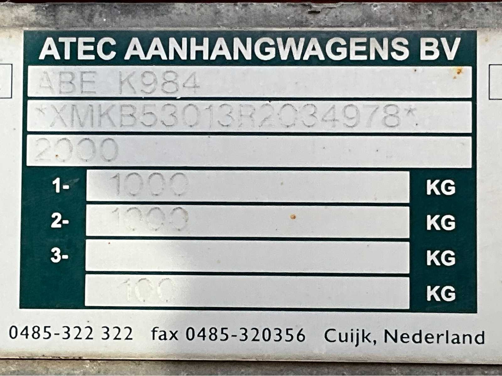 Lengte 4700 mm; breedte 1800 mm; hoogte 2100 mm; huif aanhangwagen; gegalvaniseerd staal frame; hout schotten; neuswiel; oplooprem; (de koper dient bij transport over de weg zelf te voorzien in een geldig kenteken; een 7 of 9 polige aansluitstekker of verloopstuk met kabel (verlengsnoer kan ter plaatse tegen betaling aangekocht worden); eventueel extra lichtbalk; Duitse kentekenpapieren; gelijkvormigheidsattest; (MTK-LY895) Merk: Atec Type: EB2 2-1 Bouwjaar: 2010 Chassisnummer: XMKB53013R2B34978 Aantal assen: 2 Laadbak afmeting l: 300cm Laadbak afmeting b: 130cm Ledig gewicht: 535kg Laadvermogen: 1465kg Zeiltrailer: true
