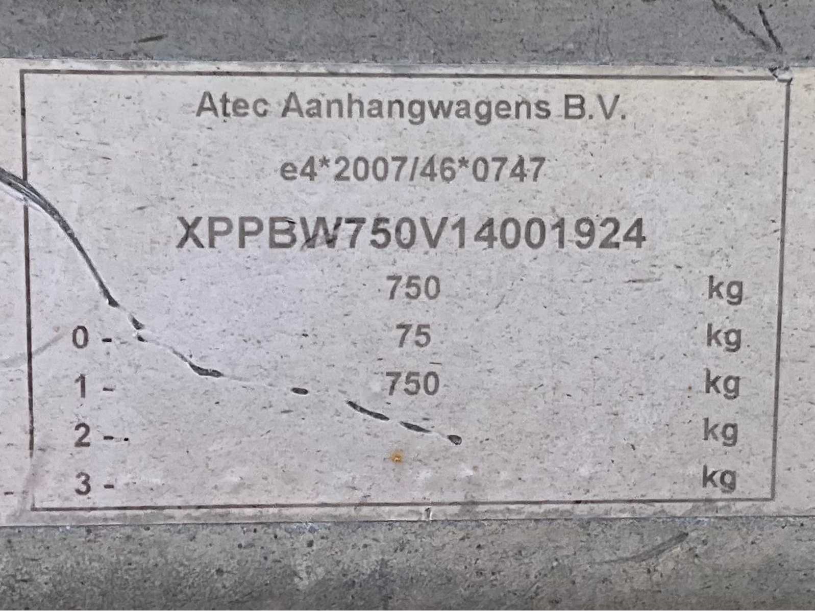 Lengte 3900 mm; breedte 1800 mm; hoogte 1500 mm; gegalvaniseerd staal frame; hout schotten; koprek; neuswiel; (de koper dient bij transport over de weg zelf te voorzien in een geldig kenteken; een 7 of 9 polige aansluitstekker of verloopstuk met kabel (verlengsnoer kan ter plaatse tegen betaling aangekocht worden); eventueel extra lichtbalk; zonder kentekenpapieren; zonder gelijkvormigheidsattest; Merk: Atec Type: EO1300 Bouwjaar: 2014 Chassisnummer: XPPBW750V14001924 Aantal assen: 1 Laadbak afmeting l: 250cm Laadbak afmeting b: 130cm