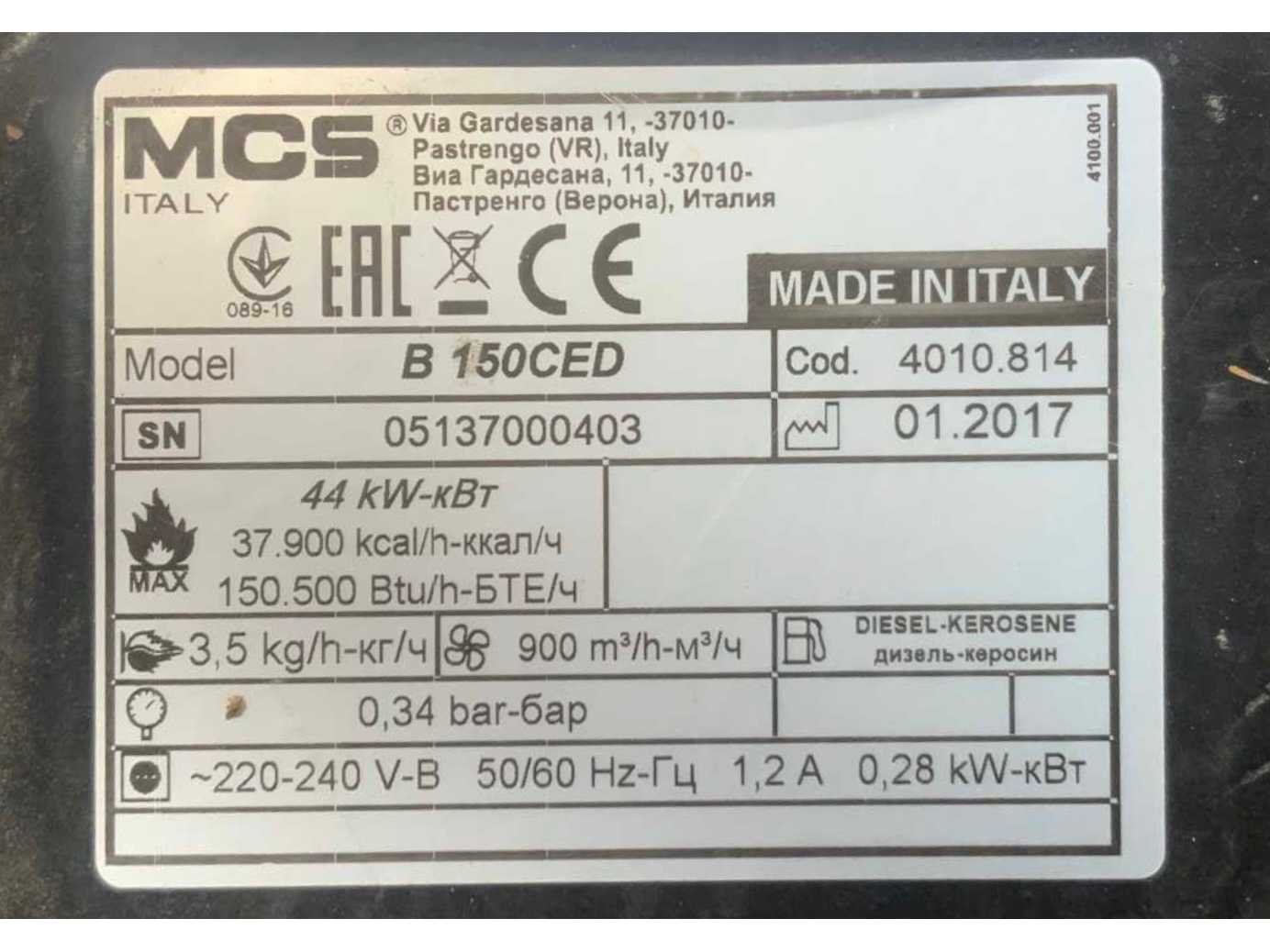 Verrijdbaar; duwbeugel; dieselgestookt; onderliggende brandstoftank; verbruik 3,5 liter / uur; volumestroom 900 m3 / uur; zonder thermostaat, working condition; Merk: MCS Type: B 150CED Bouwjaar: 2017 Vermogen: 44kW Totale afmeting L: 1100mm Totale afmeting Breedte: 400mm Totale afmeting Hoogte: 600mm Aansluiting: 230V