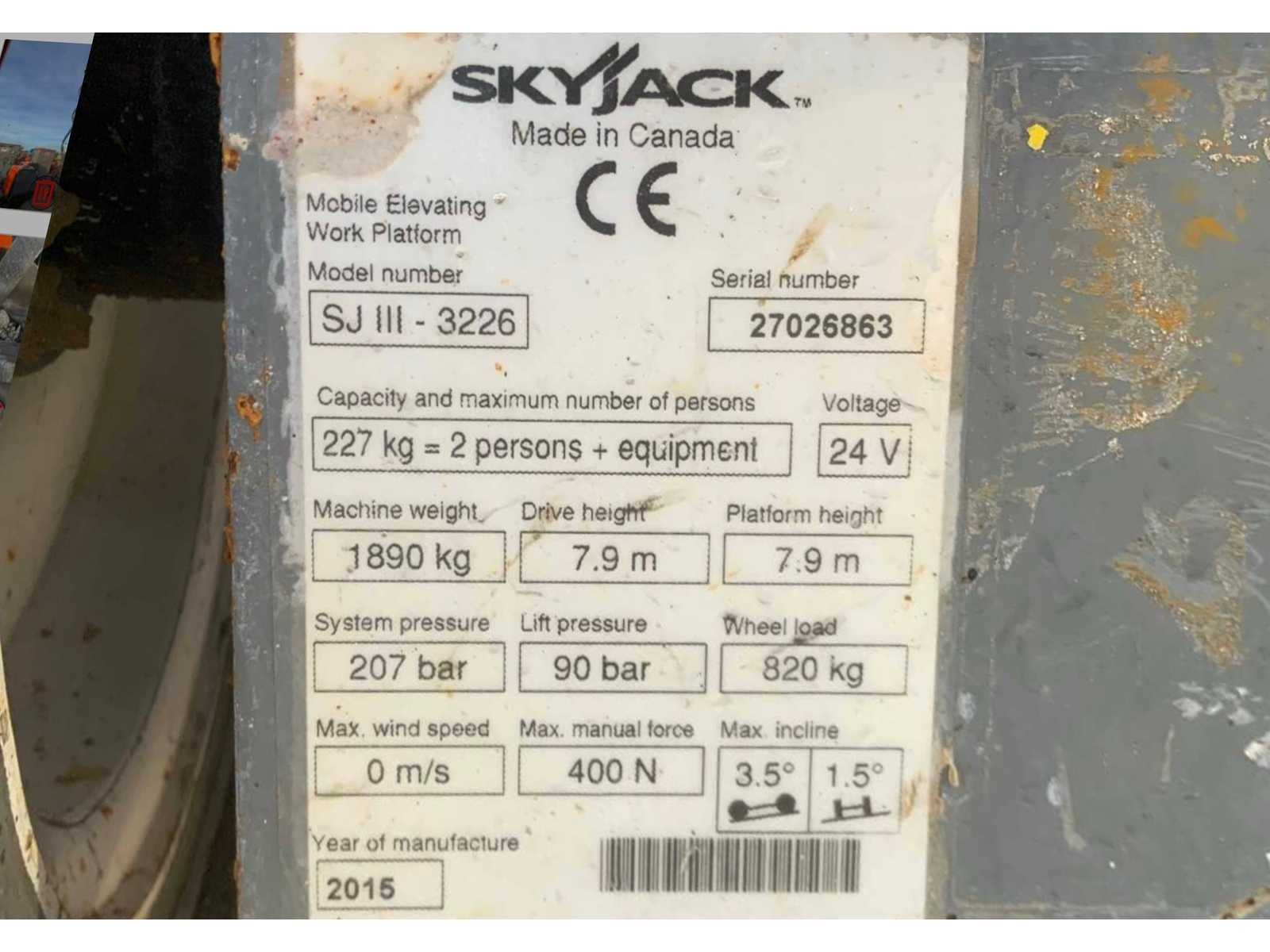 Uitschuifbaar platform afmeting circa 3000x700 mm; platform vloerhoogte 7750 mm; interne acculader 230 Volt; kooibediening; transporthoogte circa 1750 mm; working condition; Merk: SkyJack Type: SJ III 3226 Bouwjaar: 2015 Serienummer: 27026863 Elektrisch: true Schaarhoogwerker: true Werkhoogte: 9750mm Horizontale rijkwijdte: 7900mm Plateau afm. l: 2150mm Plateau afm. b: 700mm Platform capaciteit: 227kg Afgelezen urenstand: 314 Eigen gewicht: 1950kg Totale afmeting L: 2200mm Totale afmeting Breedte: 800mm Totale afmeting Hoogte: 2250mm