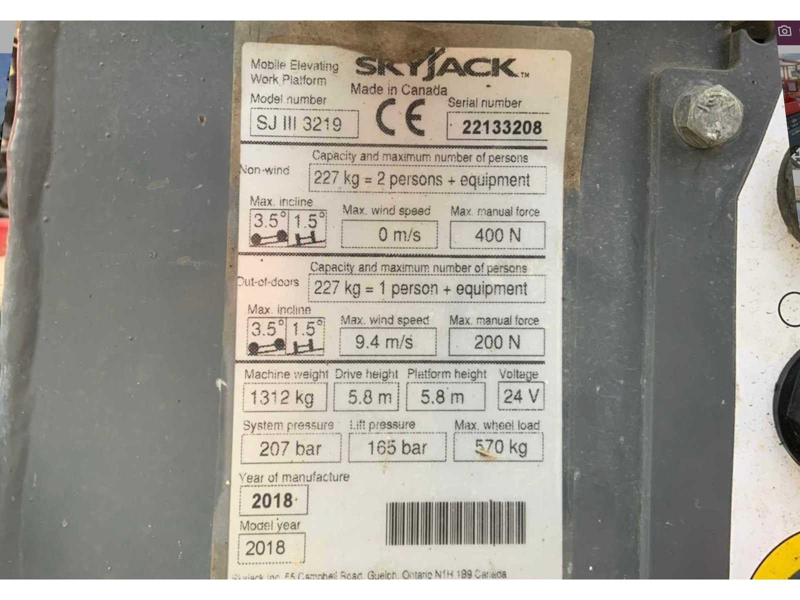 Gebruik: binnen; platform vloerhoogte 5800 mm; uitschuifbaar platform afmeting circa 2500x650 mm; interne acculader 230 Volt; kooibediening; transporthoogte circa 1750 mm; working condition; Merk: SkyJack Type: SJ III 3219 Bouwjaar: 2018 Serienummer: 22133208 Elektrisch: true Schaarhoogwerker: true Werkhoogte: 7800mm Plateau afm. l: 1600mm Plateau afm. b: 650mm Platform capaciteit: 227kg Accu lader: true Afgelezen urenstand: 299 Eigen gewicht: 1350kg Totale afmeting L: 1810mm Totale afmeting Breedte: 800mm Totale afmeting Hoogte: 2110mm