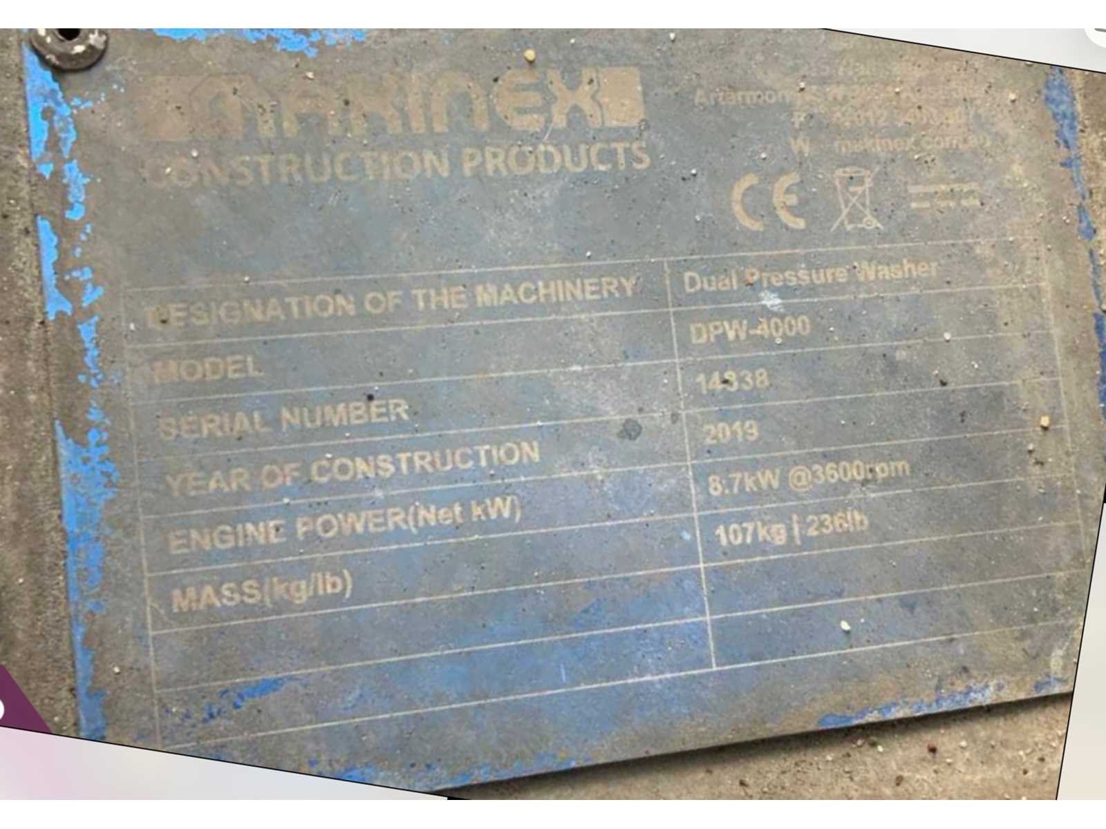Verrijdbaar; hogedruk vloerreiniger diameter 610 mm; haspel met drukleiding; neerklapbare bedieningsbeugel; Honda GX 390 Aspen4 benzinemotor; max. 4000 psi; urenstand niet afleesbaar; working condition; Merk: Makinex Type: DPW-4000 Bouwjaar: 2019 Maximale werkdruk: 275bar Eigen gewicht: 107kg Totale afmeting L: 1400mm Totale afmeting Breedte: 600mm Totale afmeting Hoogte: 1000mm