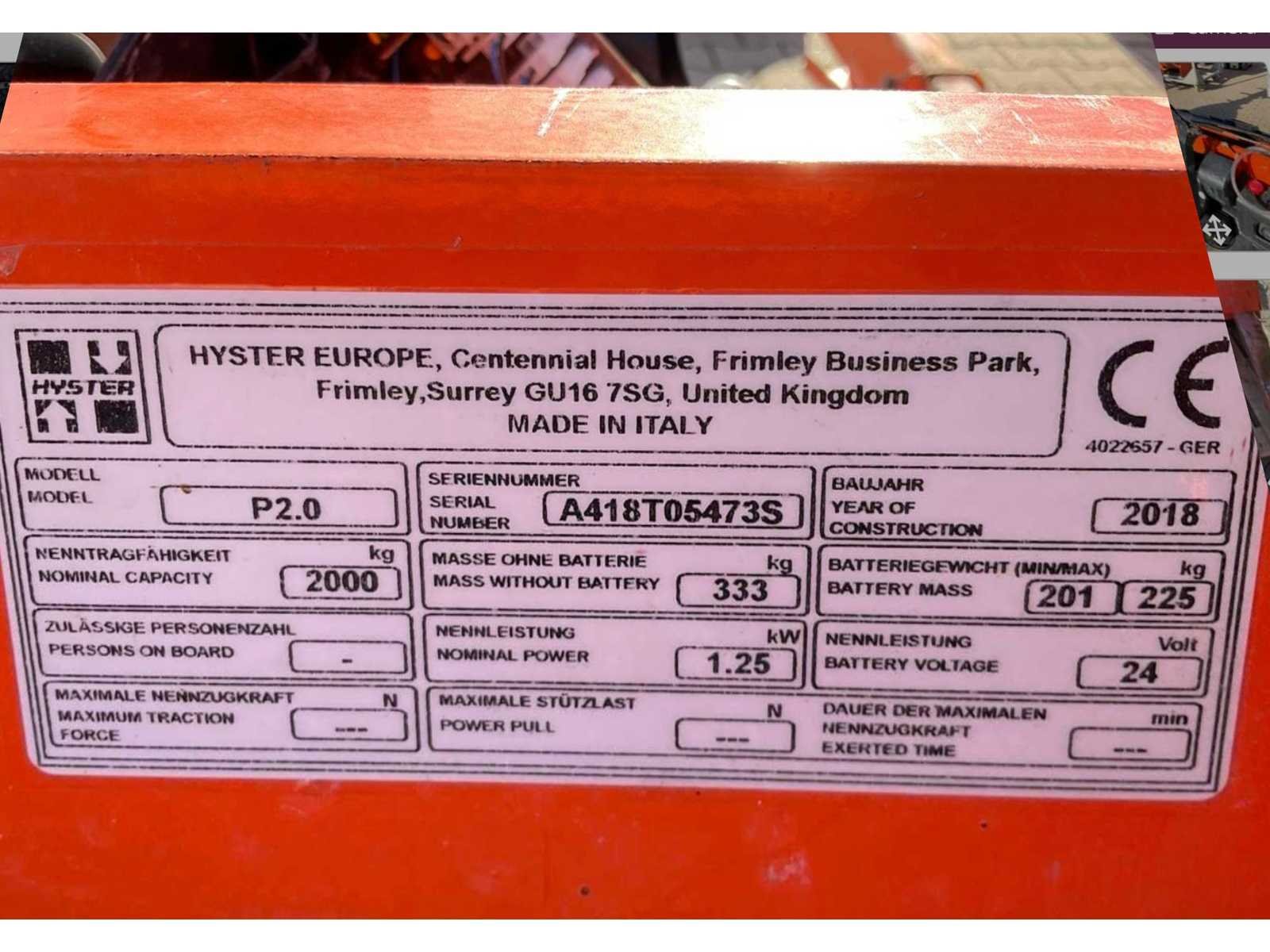 Zonder bedieningsboom; ingebouwde acculader; urenstand niet afleesbaar; not working; Merk: Hyster Type: P2.0 Bouwjaar: 2018 Serienummer: A418T05473S Hefvermogen: 2000kg Lepellengte: 1150mm Accu lader: true Eigen gewicht: 790kg Totale afmeting L: 1700mm Totale afmeting Breedte: 750mm Totale afmeting Hoogte: 1350mm