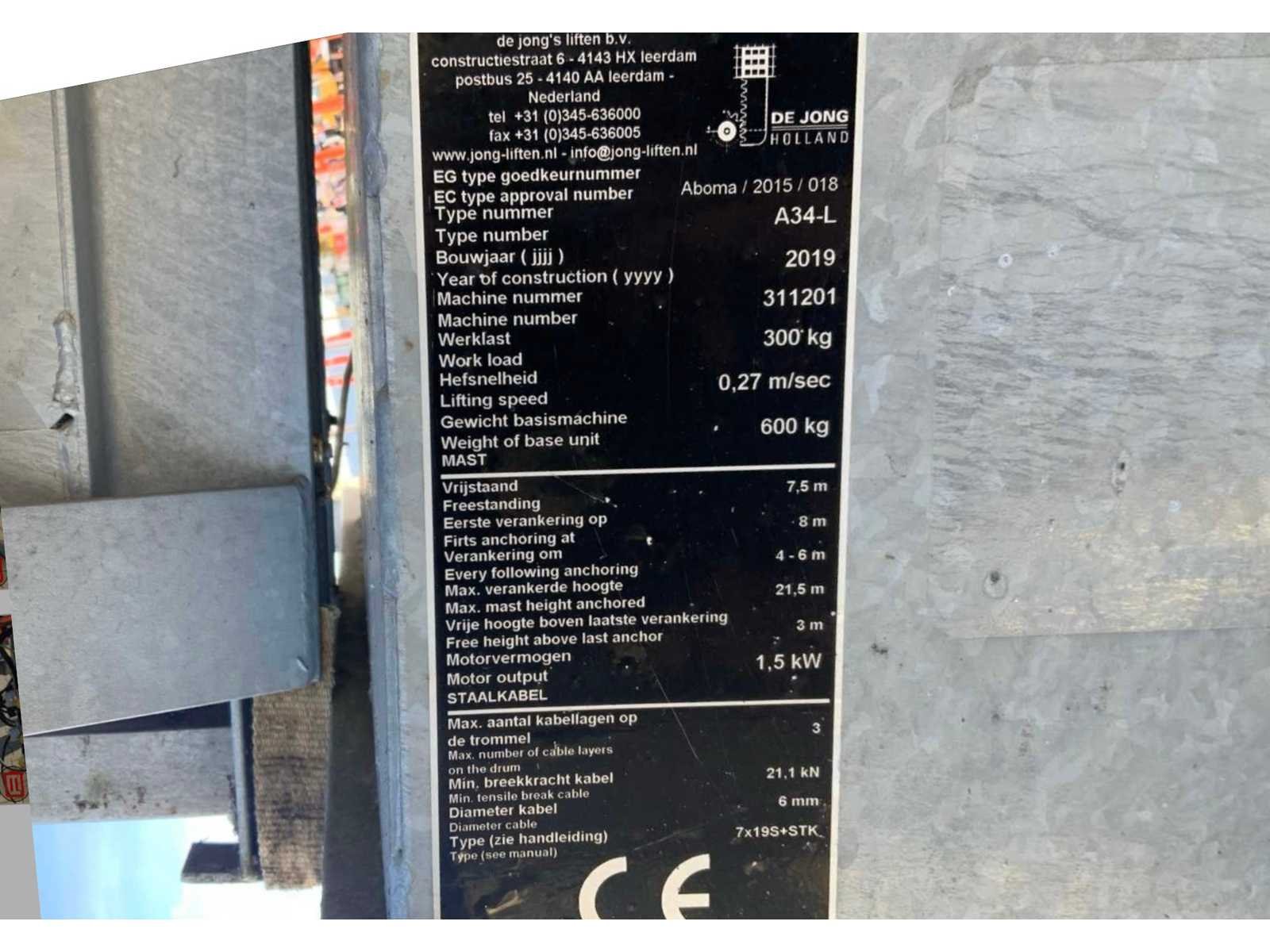 Eerste foto ter illustratie; working condition not verified; Merk: De Jong Type: A34-L Bouwjaar: 2019 Staalkabel: true Max. belasting: 300kg Hefhoogte: 7m Plateau afm. l: 1600mm Plateau afm. b: 800mm Motorvermogen (kW): 1.5kW Totale afmeting L: 8000mm
