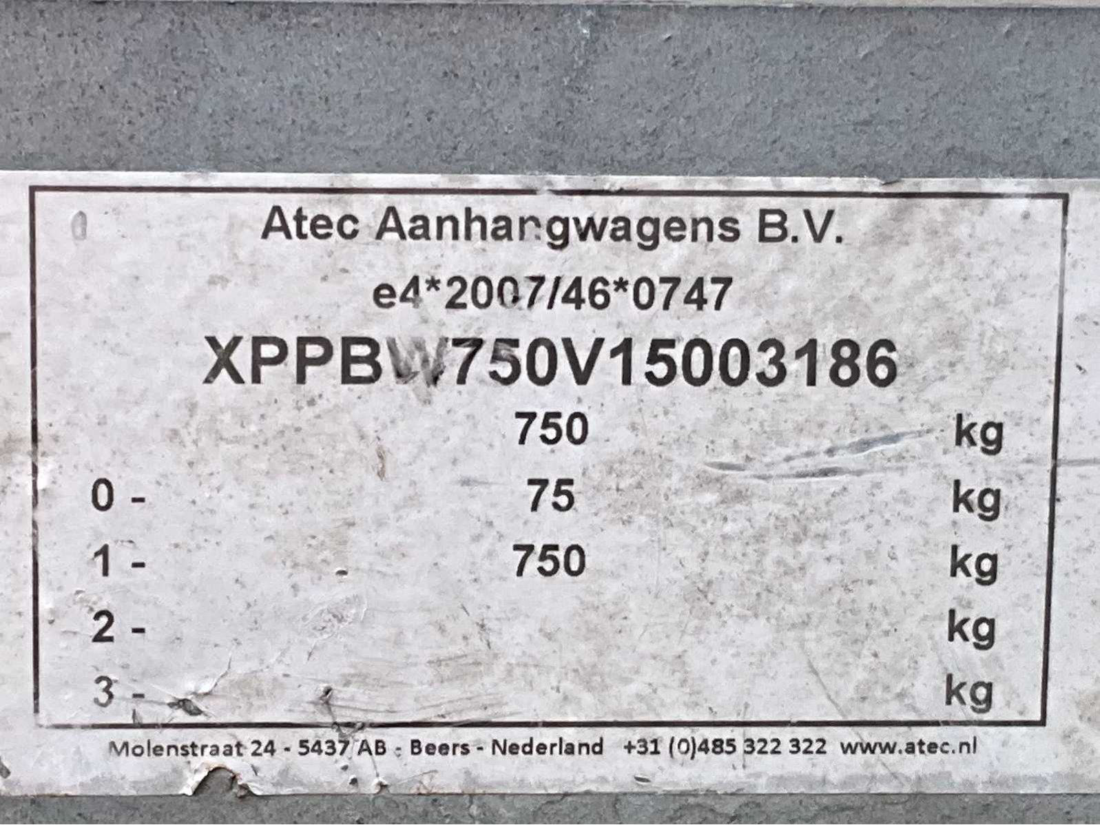 Lengte 3900 mm; breedte 1800 mm; hoogte 1500 mm; gegalvaniseerd staal frame; hout schotten; koprek; (de koper dient bij transport over de weg zelf te voorzien in een geldig kenteken; een 7 of 9 polige aansluitstekker of verloopstuk met kabel (verlengsnoer kan ter plaatse tegen betaling aangekocht worden); eventueel extra lichtbalk; zonder kentekenpapieren; zonder gelijkvormigheidsattest; Merk: Atec Type: EO1300 Bouwjaar: 2016 Chassisnummer: XPPBW750V15003186 Aantal assen: 1 Laadbak afmeting l: 250cm Laadbak afmeting b: 130cm