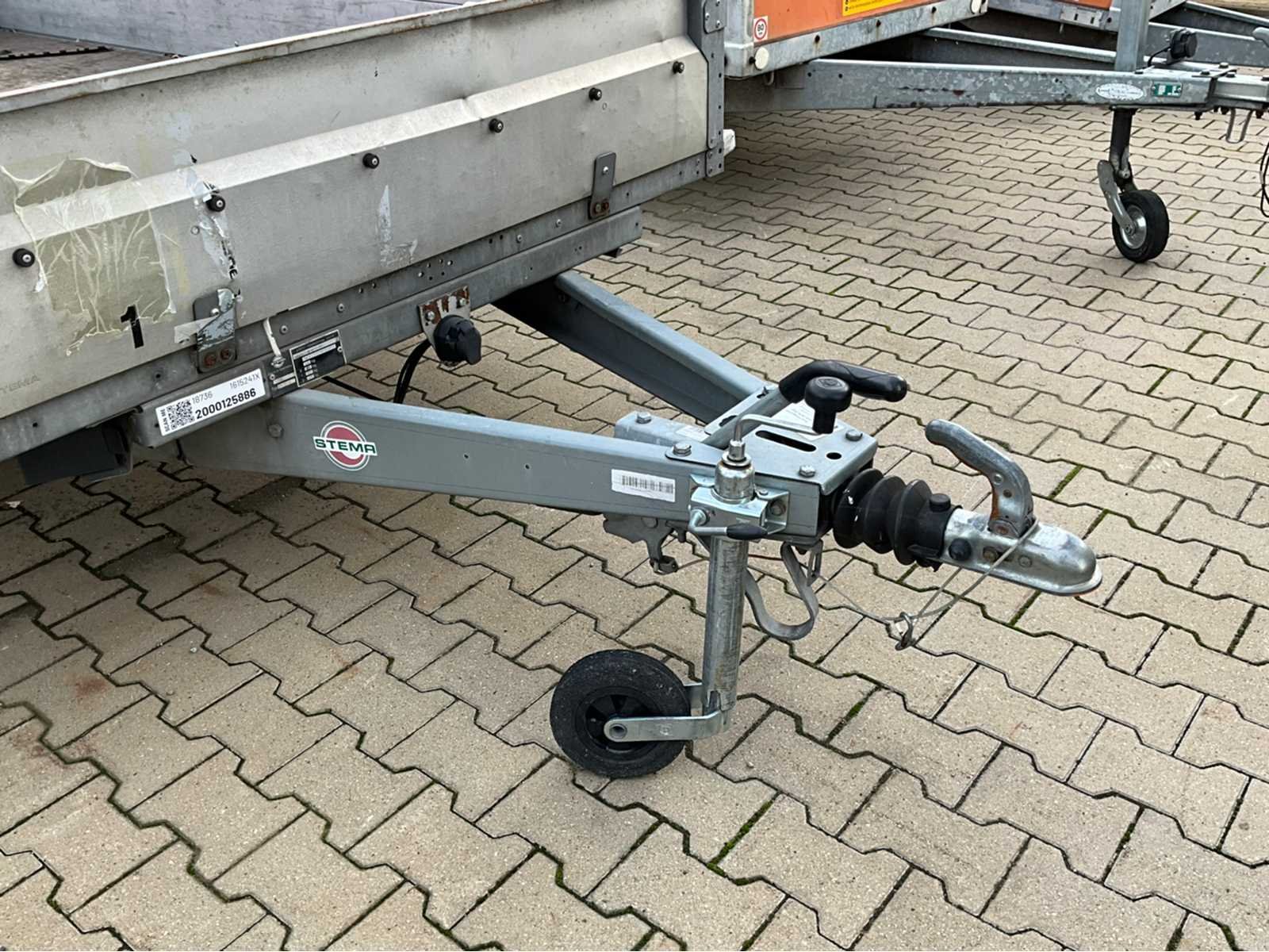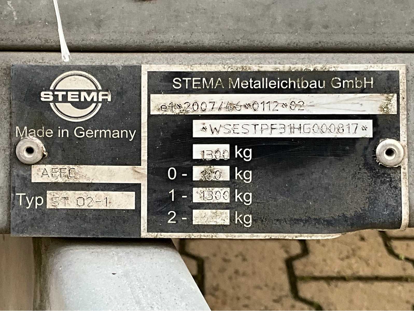 Lengte 4100 mm; breedte 2050 mm; hoogte 2500 mm; gegalvaniseerd staal frame; gegalvaniseerd staal schotten; kopschot en achterschot verbogen; neuswiel; oplooprem; zonder bouwjaar vermelding; (de koper dient bij transport over de weg zelf te voorzien in een geldig kenteken; een 7 of 9 polige aansluitstekker of verloopstuk met kabel (verlengsnoer kan ter plaatse tegen betaling aangekocht worden); eventueel extra lichtbalk); Duitse kentekenpapieren; gelijkvormigheidsattest; (K-KQ8025) Merk: Stema Type: ST02-1 Chassisnummer: WSESTPF31HG000817 Laadbak afmeting l: 300cm Laadbak afmeting b: 150cm