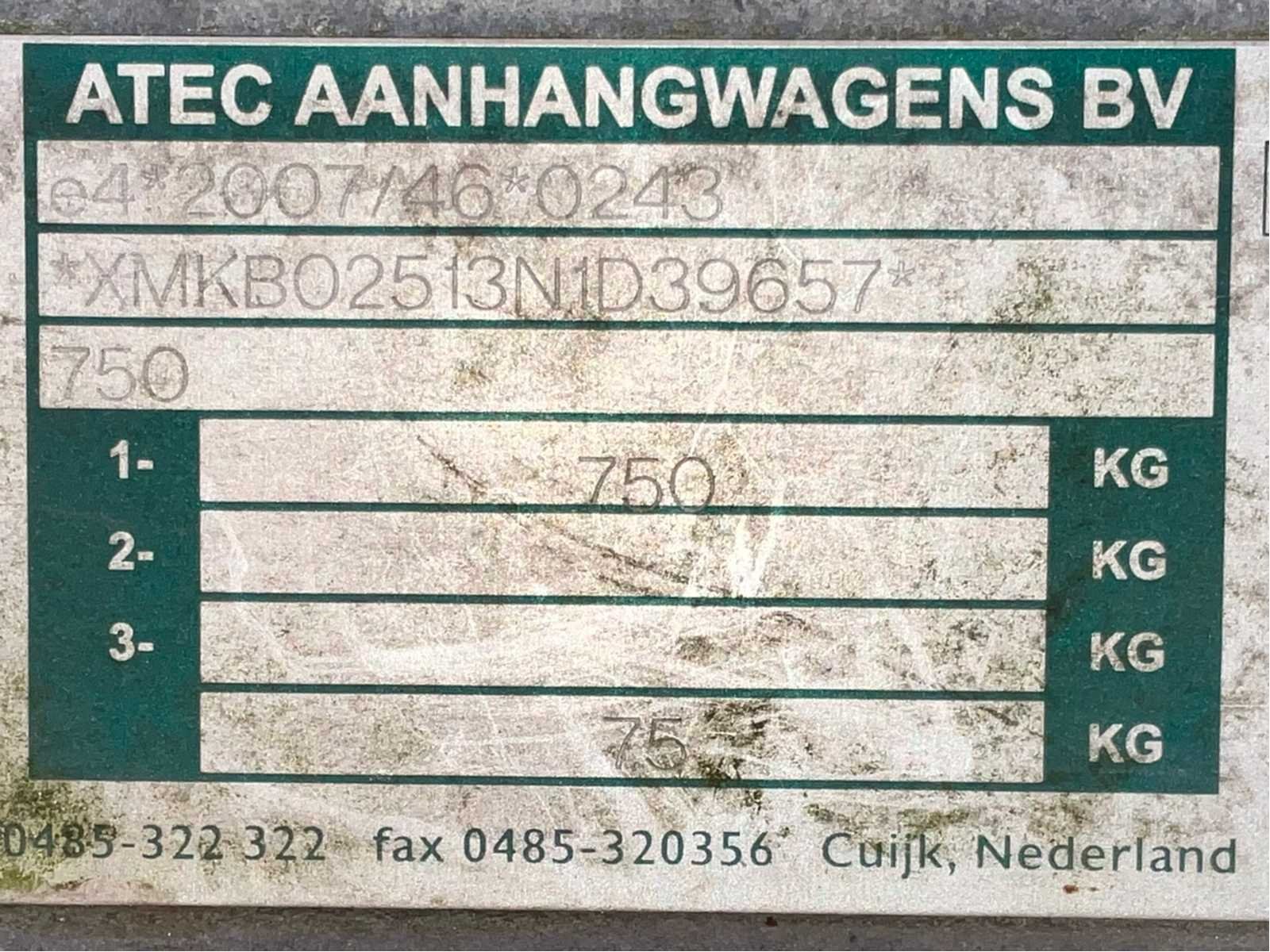Lengte 3900 mm; breedte 1750 mm; hoogte 1500 mm; gegalvaniseerd staal frame; hout schotten; koprek; neuswiel; (de koper dient bij transport over de weg zelf te voorzien in een geldig kenteken; een 7 of 9 polige aansluitstekker of verloopstuk met kabel (verlengsnoer kan ter plaatse tegen betaling aangekocht worden); eventueel extra lichtbalk); zonder kentekenpapieren; zonder gelijkvormigheidsattest; Merk: Atec Type: EO1300 Bouwjaar: 2013 Chassisnummer: XMKB02513N1D39657 Aantal assen: 1 Laadbak afmeting l: 250cm Laadbak afmeting b: 130cm