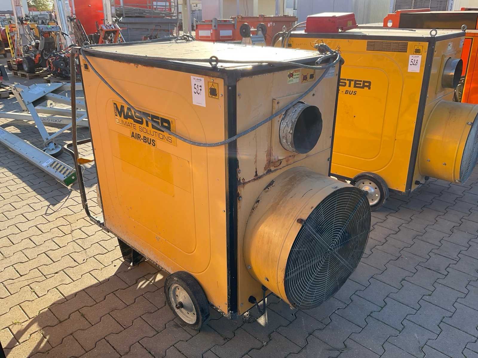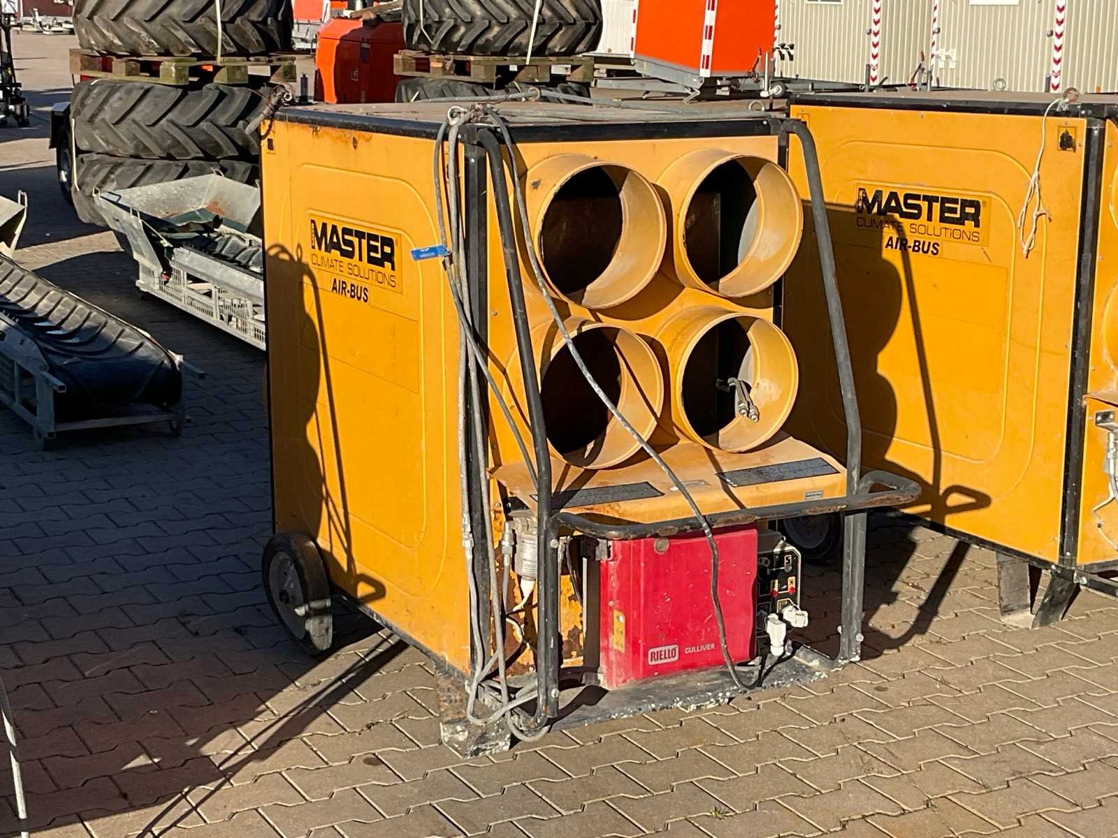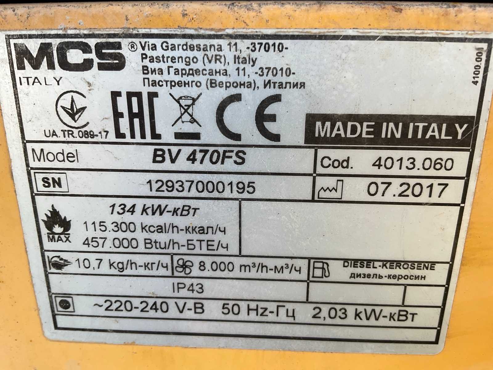Vermogen: 134,00 kW; ventilator: ja; totale afmeting L: 1700 mm; totale afmeting B: 900 mm; totale afmeting H: 1650 mm; aansluiting: 230 Volt; omschrijving: verrijdbaar; diesel gestookt; brander Riello; volumestroom 8000 m3 / uur; 230 Volt; 8,8 Ampère; 2 kW; 4x luchtuitlaat diameter 270 mm; rookgasafvoer; brandstofleiding; hijsogen; wielen krom; working condition not verified; Merk: MCS Type: Master Air-Bus BV 470 FS Bouwjaar: 2017 Serienummer: 12937000195