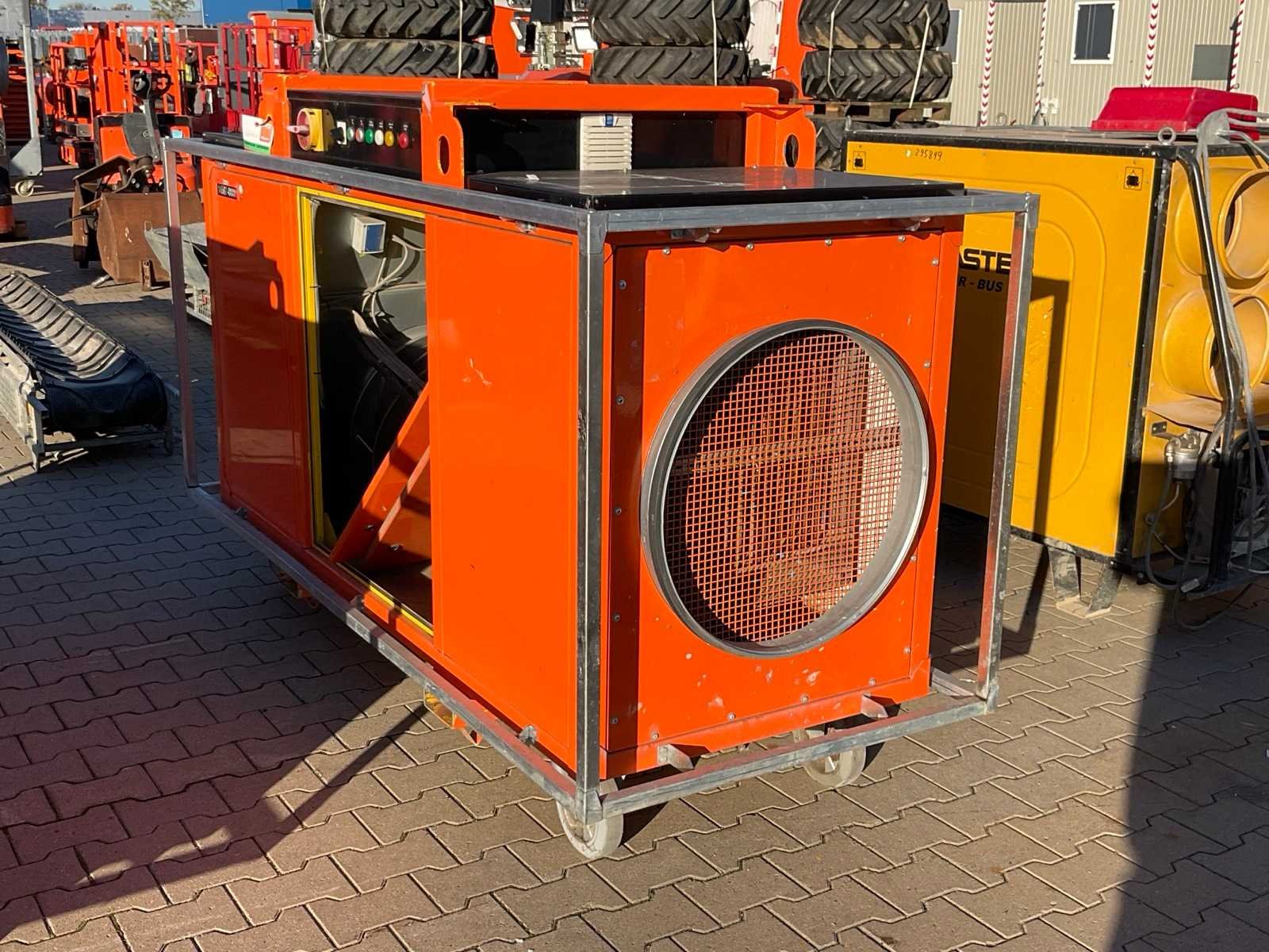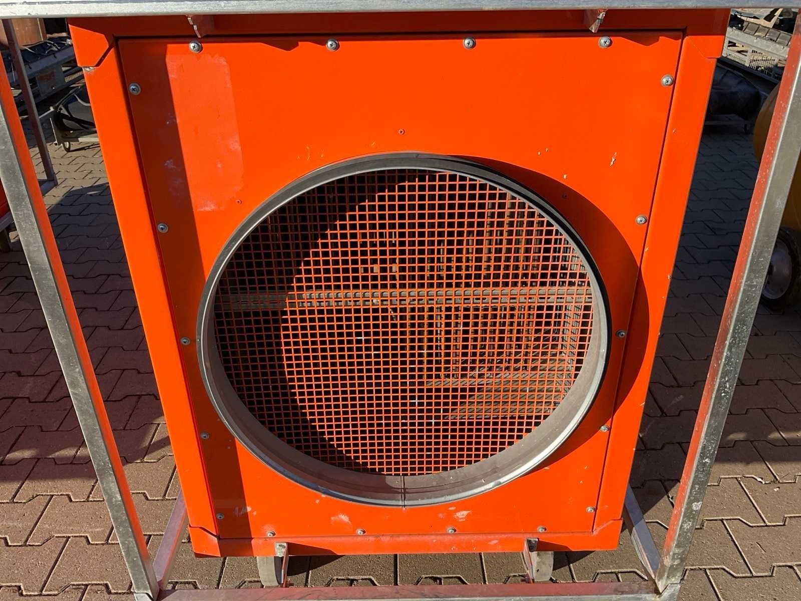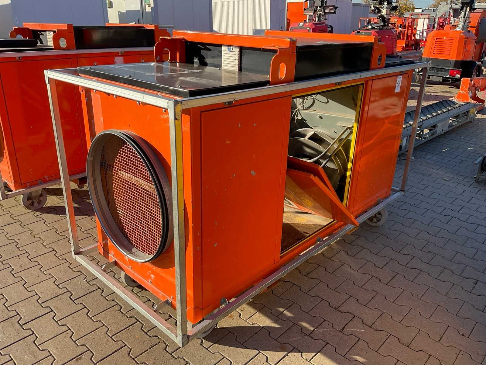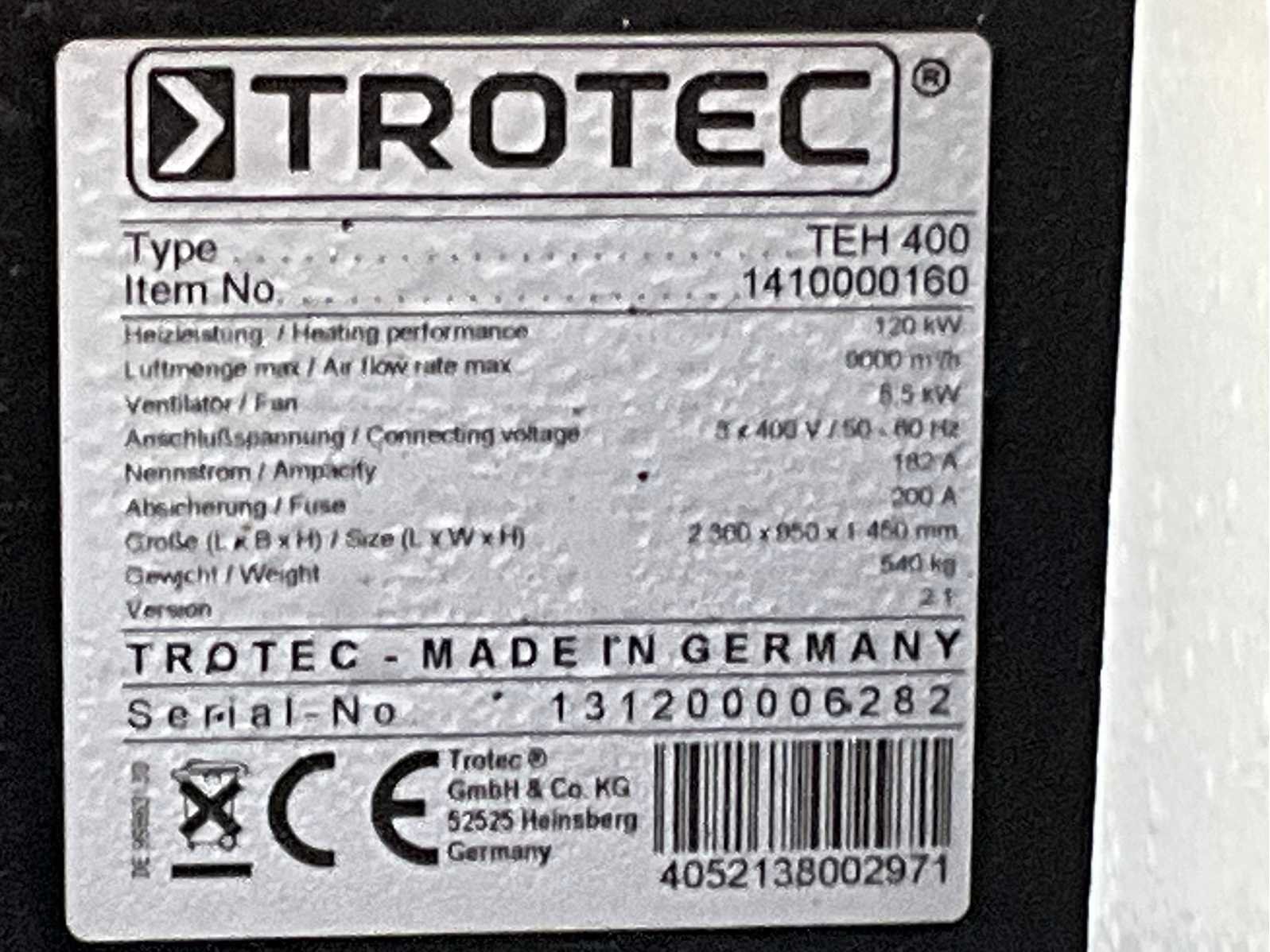 In verrijdbaar frame, hijsogen, diameter uitlaat 600 mm, not working; Merk: Trotec Type: TEH 400 Serienummer: 131200006282 Vermogen: 120kW Capaciteit.: 9000m³/hr Mobiel: true Aansluiting: 400V Eigen gewicht: 540kg Totale afmeting L: 2300mm Totale afmeting Breedte: 950mm Totale afmeting Hoogte: 1450mm