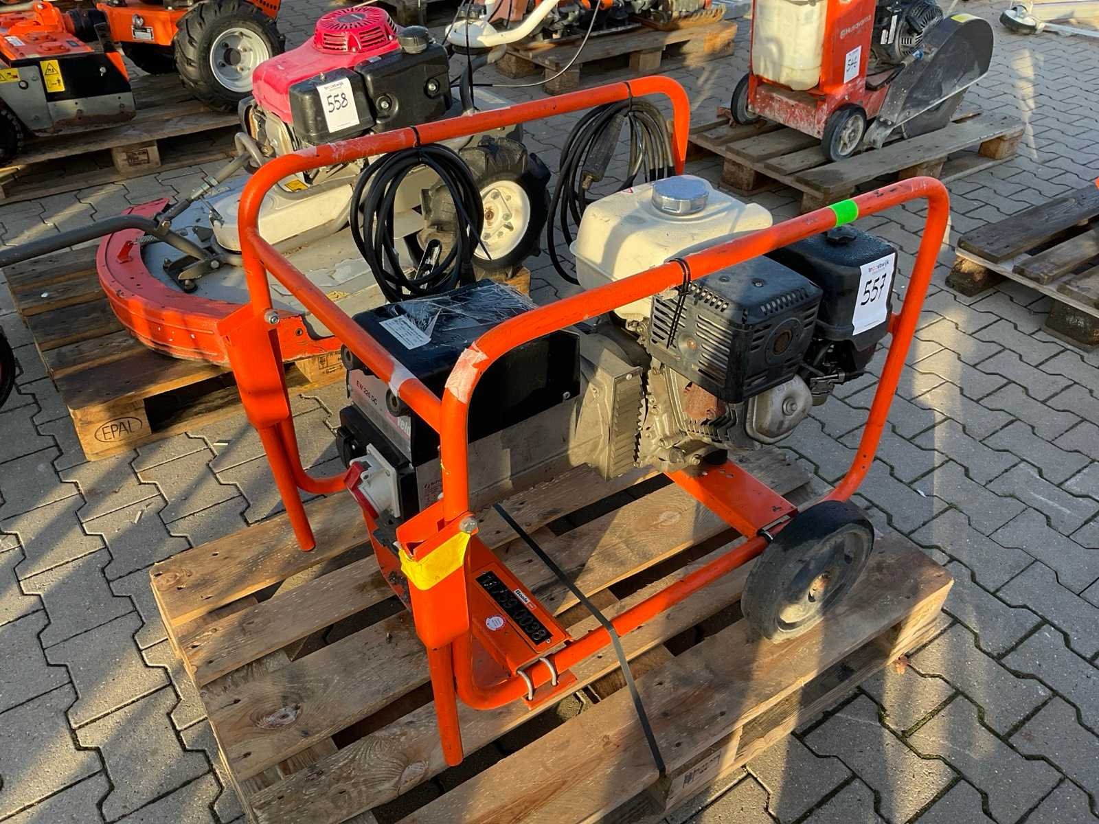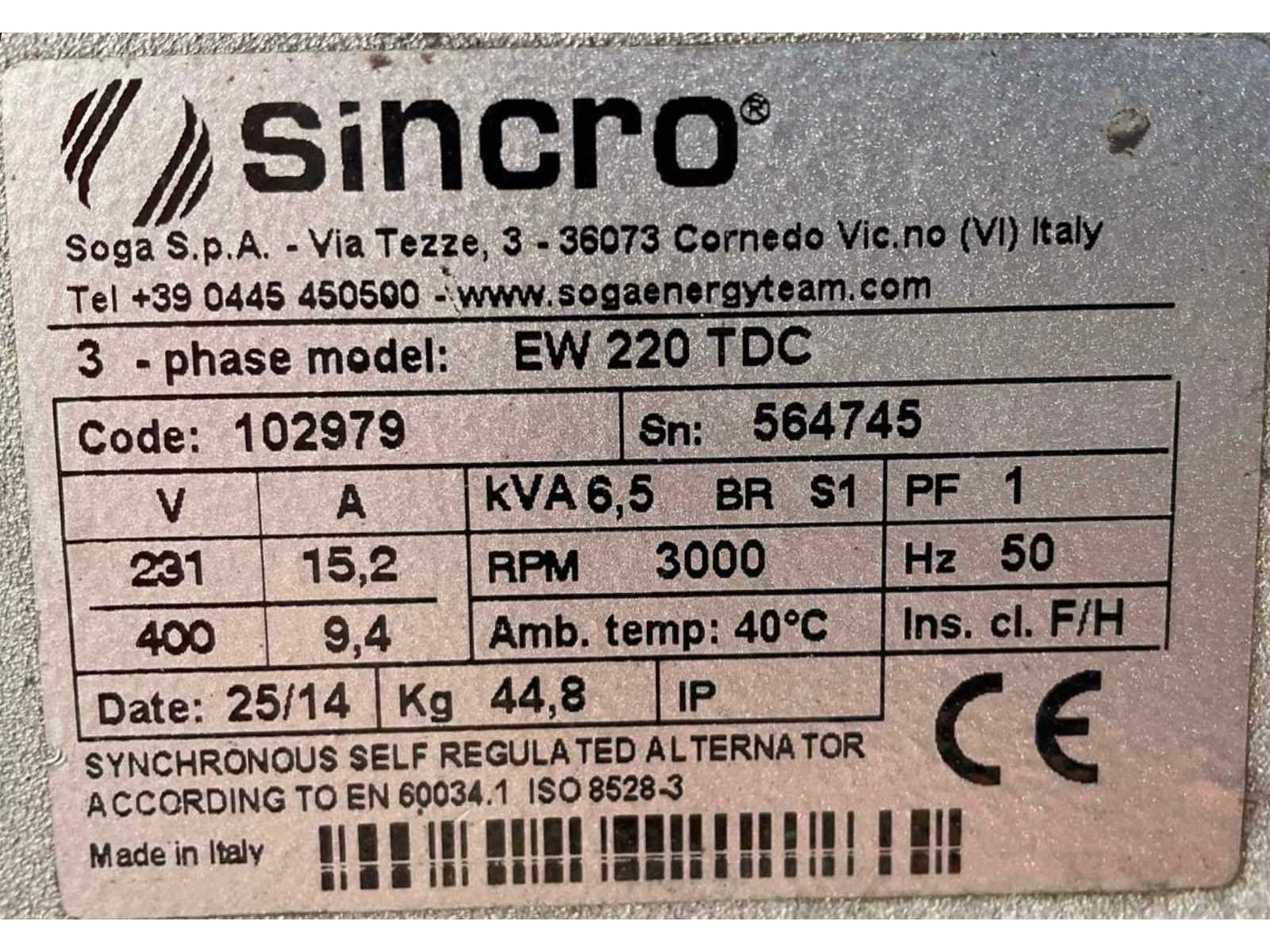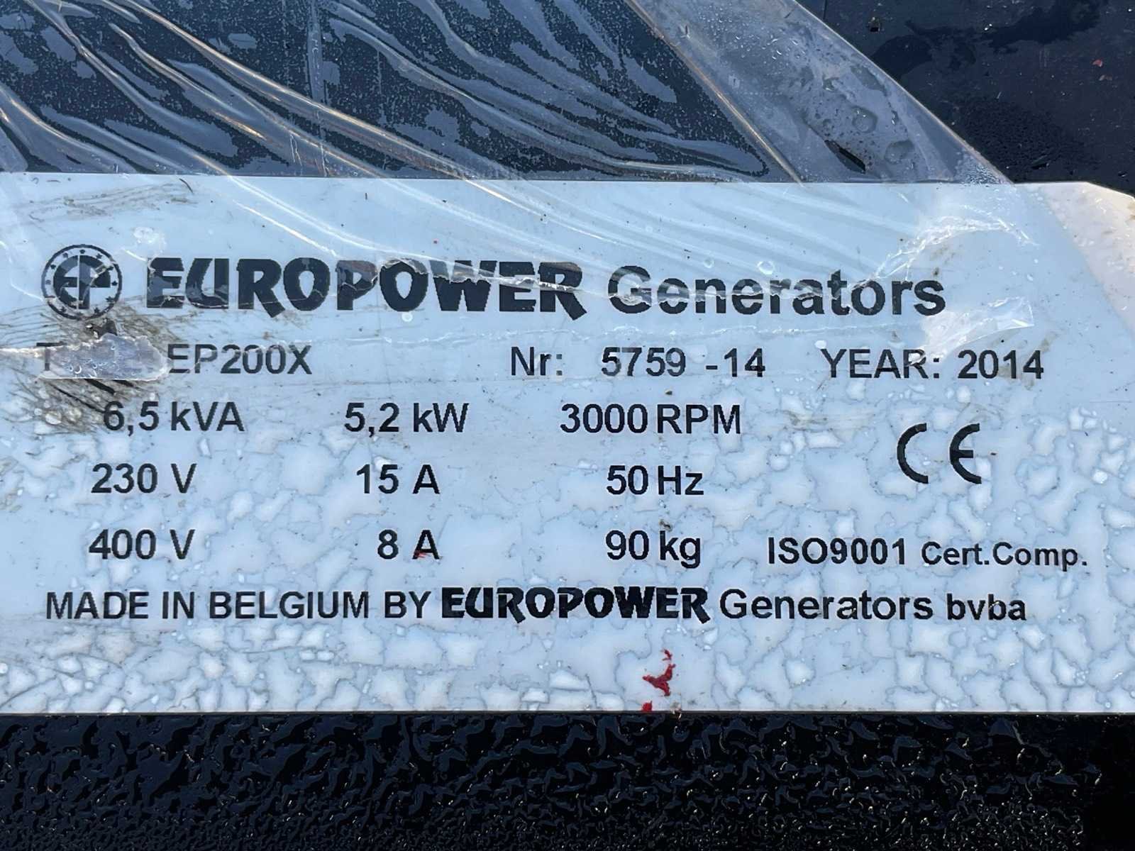 Ampère belasting: 220 Ampère; aansluiting: 400 Volt; machinegewicht: 90 kg; afmeting L: 900 mm; afmeting B: 650 mm; afmeting H: 750 mm; omschrijving: 6,5 kVA; Honda GX 390 motor; gemonteerd in verrijdbaar buisstaal frame; working condition; Merk: Europower / Sincro Type: EP200X / EW220DC Serienummer: 5759-14 Bouwjaar: 2014