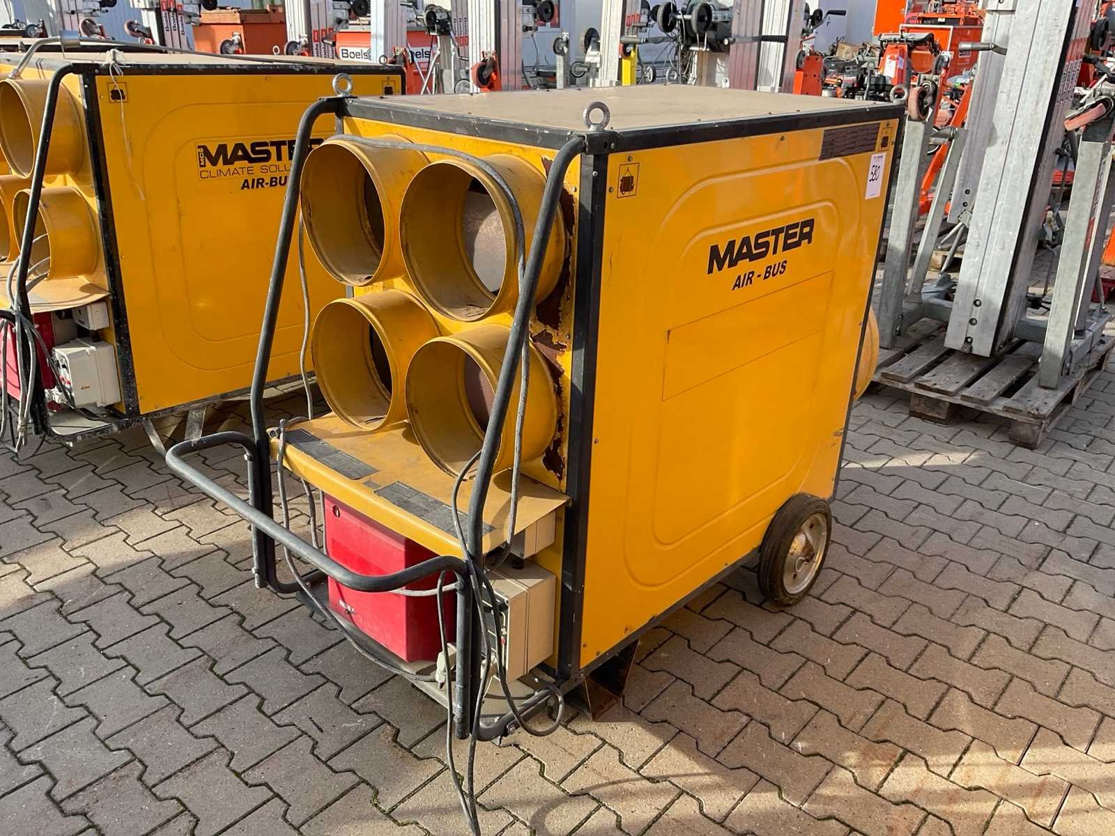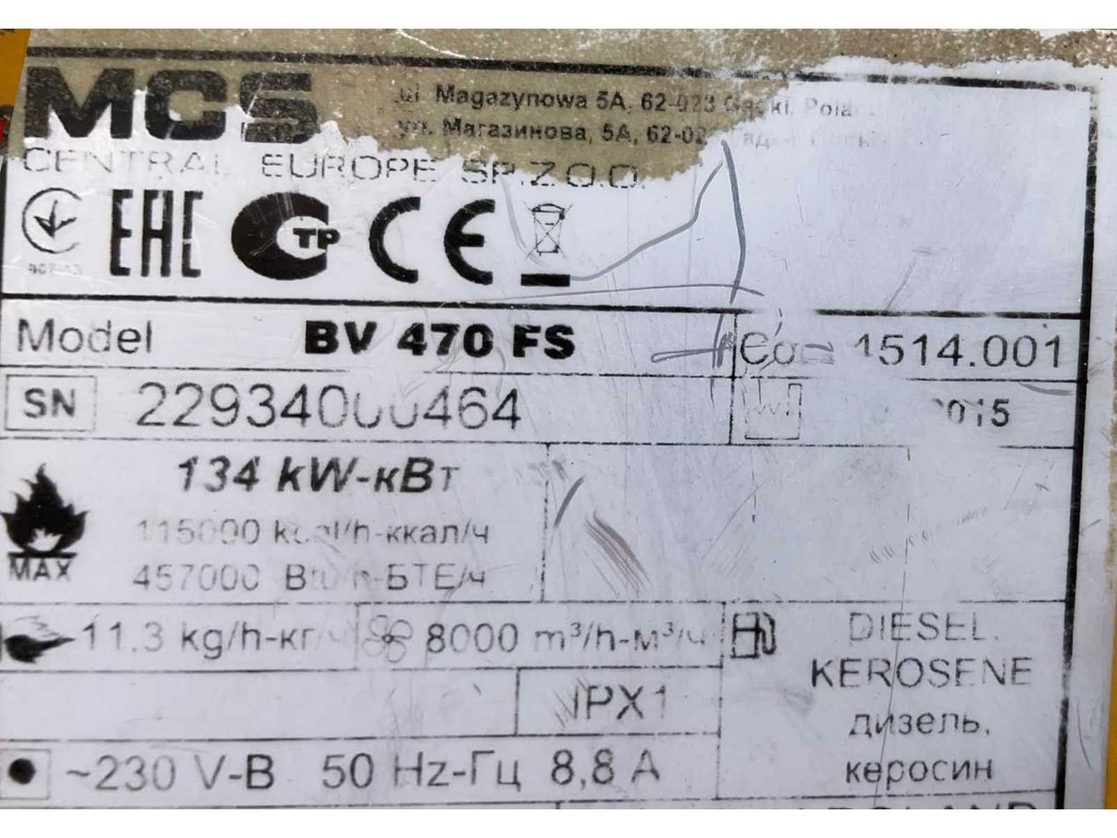 Vermogen: 134,00 kW; ventilator: ja; totale afmeting L: 1700 mm; totale afmeting B: 900 mm; totale afmeting H: 1650 mm; aansluiting: 230 Volt; omschrijving: verrijdbaar; diesel gestookt; brander Riello; volumestroom 8000 m3 / uur; 230 Volt; 8,8 Ampère; 2 kW; 4x luchtuitlaat diameter 270 mm; rookgasafvoer; brandstofleiding; hijsogen; working condition not verified; Merk: MCS Type: Master Air-Bus BV 470 FS Bouwjaar: 2015 Serienummer: 22934000464