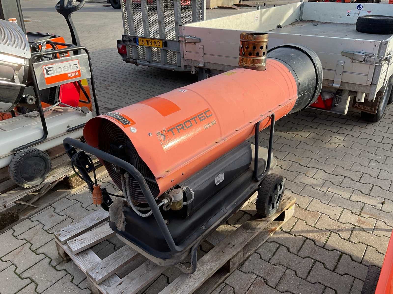 Verrijdbaar; dieselgestookt; onderliggende brandstoftank; tankinhoud 68 liter; verbruik 7,8 liter / uur; volumestroom 2000 m3 / uur; schouw; schoorsteenhoed; working condition not verified; Merk: Trotec Type: IDE 80 Bouwjaar: 2014 Serienummer: 2014/09/0087 Vermogen: 80kW Ventilator: true Eigen gewicht: 60kg Totale afmeting L: 1630mm Totale afmeting Breedte: 580mm Totale afmeting Hoogte: 800mm Aansluiting: 230V