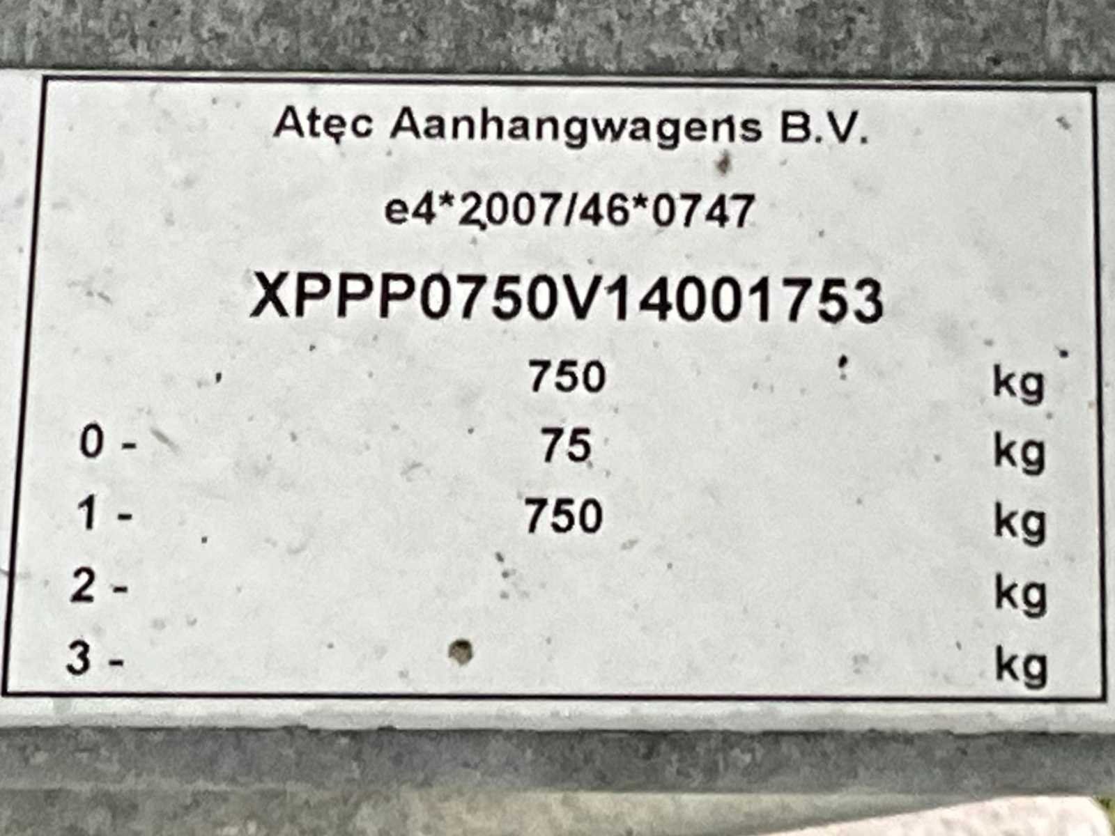 Lengte 3900 mm; breedte 1550 mm; hoogte 2200 mm; huif; gegalvaniseerd staal frame; aluminium schotten; koprek; (de koper dient bij transport over de weg zelf te voorzien in een geldig kenteken; een 7 of 9 polige aansluitstekker of verloopstuk met kabel (verlengsnoer kan ter plaatse tegen betaling aangekocht worden); eventueel extra lichtbalk; zonder kentekenpapieren; zonder gelijkvormigheidsattest; Merk: Atec Type: PL10 1300 Bouwjaar: 2014 Chassisnummer: XPPP0750V14001753 Aantal assen: 1 Laadbak afmeting l: 255cm Laadbak afmeting b: 150cm