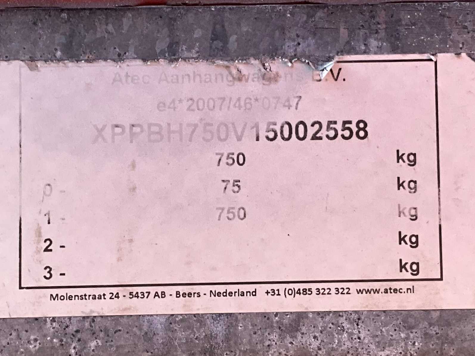 Lengte 3900 mm; breedte 1800 mm; hoogte 2100 mm; huif; gegalvaniseerd staal frame; hout schotten; koprek; neuswiel; (de koper dient bij transport over de weg zelf te voorzien in een geldig kenteken; een 7 of 9 polige aansluitstekker of verloopstuk met kabel (verlengsnoer kan ter plaatse tegen betaling aangekocht worden); eventueel extra lichtbalk); zobder kentekenpapieren; zonder gelijkvormigheidsattest; Merk: Atec Type: EO1300 Bouwjaar: 2015 Chassisnummer: XPPBH750V15002558 Aantal assen: 1 Laadbak afmeting l: 250cm Laadbak afmeting b: 130cm Zeiltrailer: true