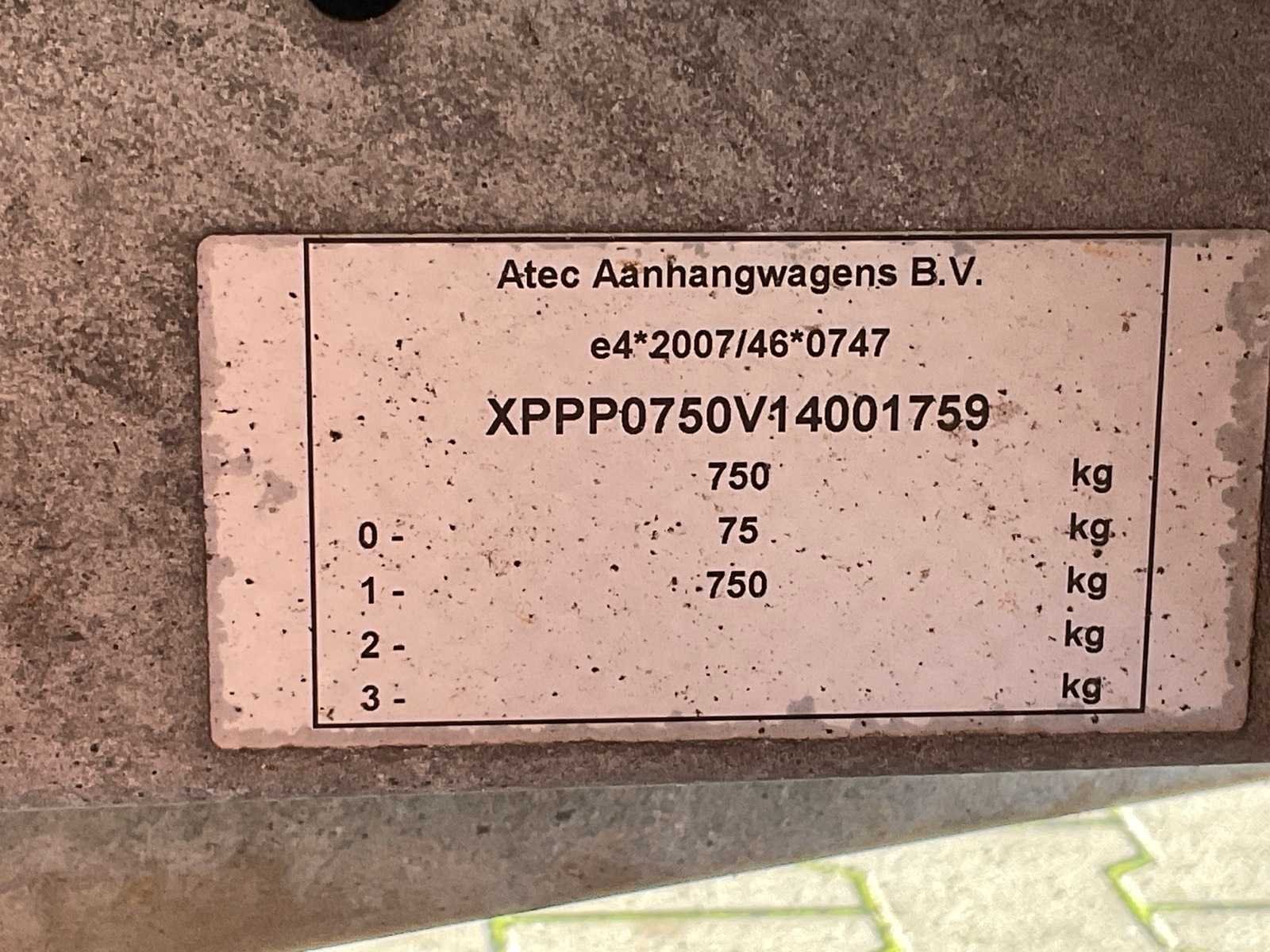 Lengte 3900 mm; breedte 1550 mm; hoogte 2200 mm; zeil; gegalvaniseerd staal frame; aluminium schotten; koprek; neuswiel; (de koper dient bij transport over de weg zelf te voorzien in een geldig kenteken; een 7 of 9 polige aansluitstekker of verloopstuk met kabel (verlengsnoer kan ter plaatse tegen betaling aangekocht worden); eventueel extra lichtbalk; buitenlandse kentekenpapieren; zonder gelijkvormigheidsattest; Merk: Atec Type: PL10 1300 Bouwjaar: 2014 Chassisnummer: XPPP0750V14001759 Aantal assen: 1 Laadbak afmeting l: 255cm Laadbak afmeting b: 150cm