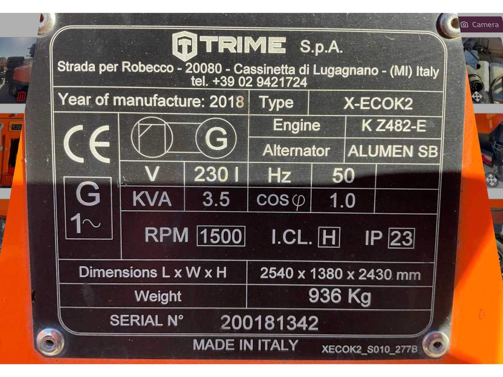 Serienummer 200181342; lengte 2540 mm; breedte 1380 mm; hoogte 2430 mm; omschrijving: Kubota diesel motor; Alumen alternator; geen lampen; 230 Volt; 5 kVA; brandstoftank 110 liter; hydraulische mast; maximale masthoogte circa 8,5 meter; 4x stelvoet; hijsoog; urenstand niet afleesbaar; not working; (de koper dient bij transport over de weg zelf te voorzien in een geldig kenteken; een 7 of 9 polige aansluitstekker of verloopstuk met kabel (verlengsnoer kan ter plaatse tegen betaling aangekocht worden); eventueel extra lichtbalk; Duitse kentekenpapieren; gelijkvormigheidsattest; (VIE-GY365) Merk: Trime Type: X-ECO A0031 LED Bouwjaar: 2018 Chassisnummer: ZPGXE110C18001349 Aantal assen: 1 Ledig gewicht: 936kg Laadvermogen: 164kg