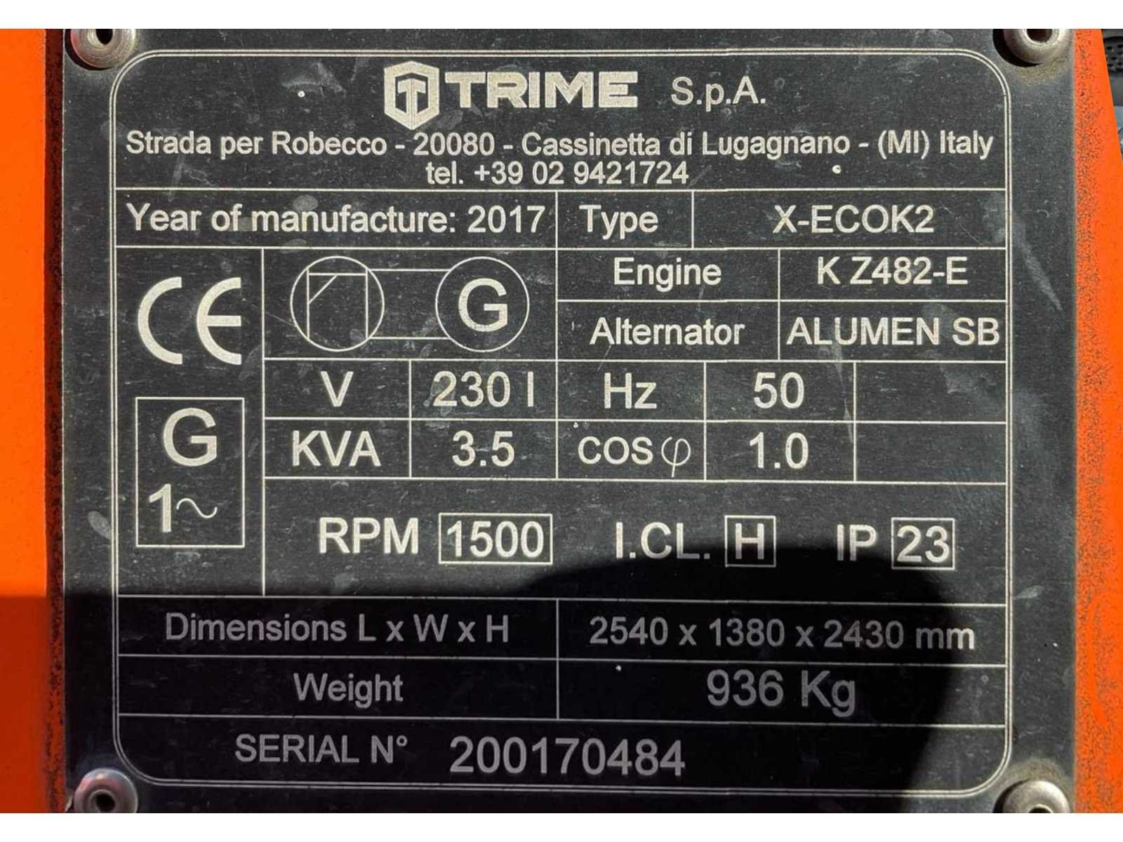 Serienummer 200170484; lengte 2540 mm; breedte 1380 mm; hoogte 2430 mm; omschrijving: Kubota diesel motor; Alumen alternator; 6x150 Watt LED lampen; 230 Volt; 5 kVA; brandstoftank 110 liter; hydraulische mast; maximale masthoogte circa 8,5 meter; 4x stelvoet, 1x krom; hijsoog; urenstand niet afleesbaar; not working; (de koper dient bij transport over de weg zelf te voorzien in een geldig kenteken; een 7 of 9 polige aansluitstekker of verloopstuk met kabel (verlengsnoer kan ter plaatse tegen betaling aangekocht worden); eventueel extra lichtbalk; Belgische kentekenpapieren; gelijkvormigheidsattest; (Q-AFD-562) Merk: Trime Type: X-ECO A0031 LED Bouwjaar: 2017 Chassisnummer: ZPGXE110C1700456 Aantal assen: 1 Ledig gewicht: 936kg Laadvermogen: 164kg