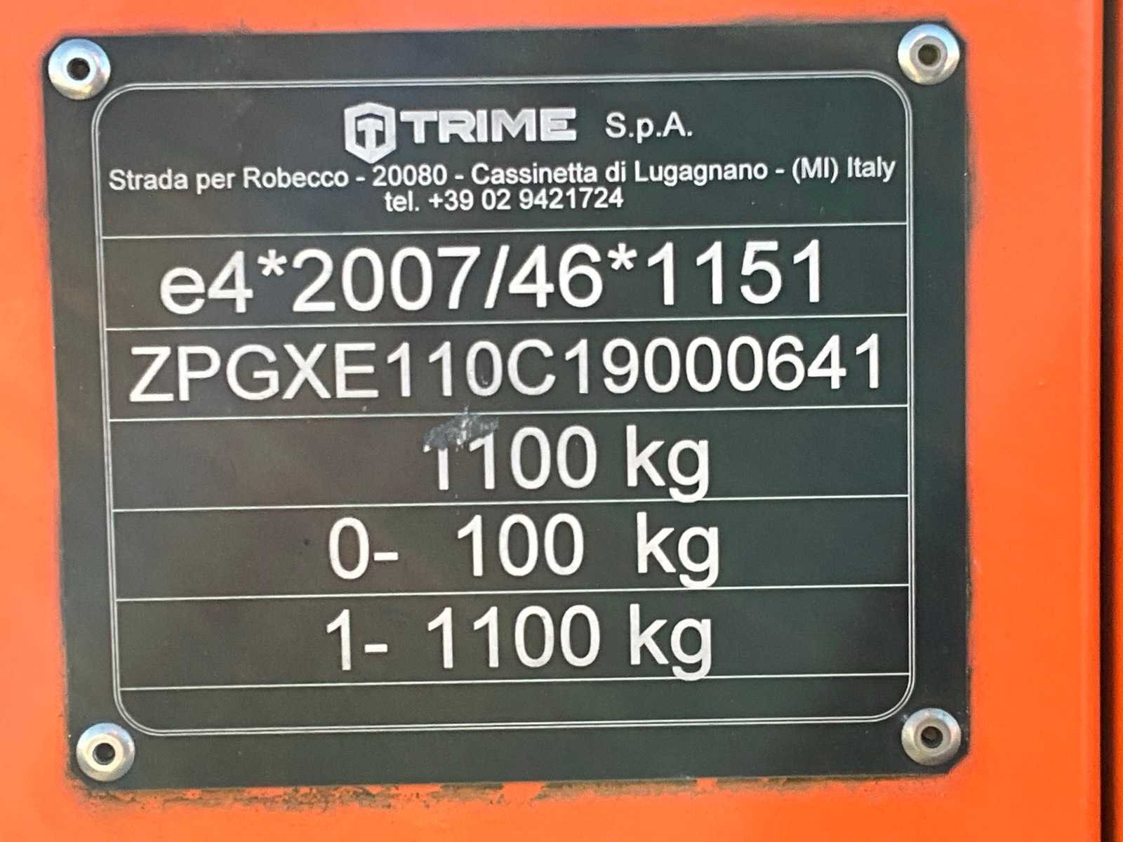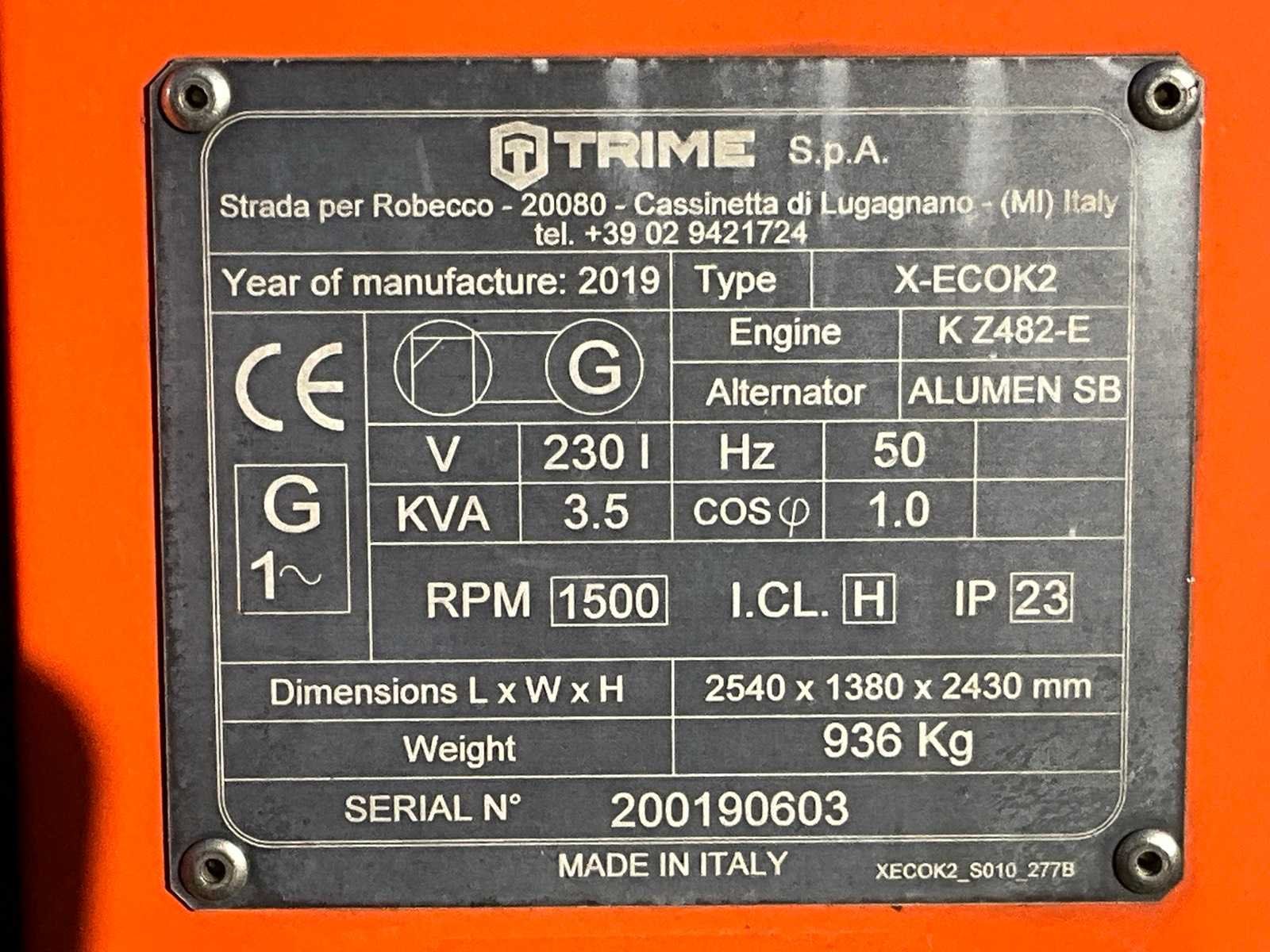 Serienummer 200170411; lengte 2540 mm; breedte 1380 mm; hoogte 2430 mm; diesel motor; Alumen alternator; 6x150 Watt LED lampen; 230 Volt; 5 kVA; brandstoftank 110 liter; hydraulische mast; maximale masthoogte circa 8,5 meter; 2x stelvoet; urenstand niet afleesbaar; hijsoog; zonder aanhangwagen koppeling; achterlichten te herstellen; not working; (de koper dient bij transport over de weg zelf te voorzien in een geldig kenteken; een 7 of 9 polige aansluitstekker of verloopstuk met kabel (verlengsnoer kan ter plaatse tegen betaling aangekocht worden); eventueel extra lichtbalk; Nederlands kenteken reeds geexporteerd; zonder gelijkvormigheidsattest); Merk: Trime Type: X-ECOK2 Bouwjaar: 2019 Chassisnummer: ZPGXE110C19000641 Aantal assen: 1 Ledig gewicht: 936kg Laadvermogen: 164kg Nationaliteit documenten: NL