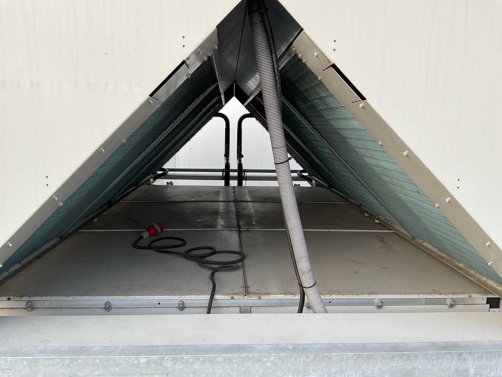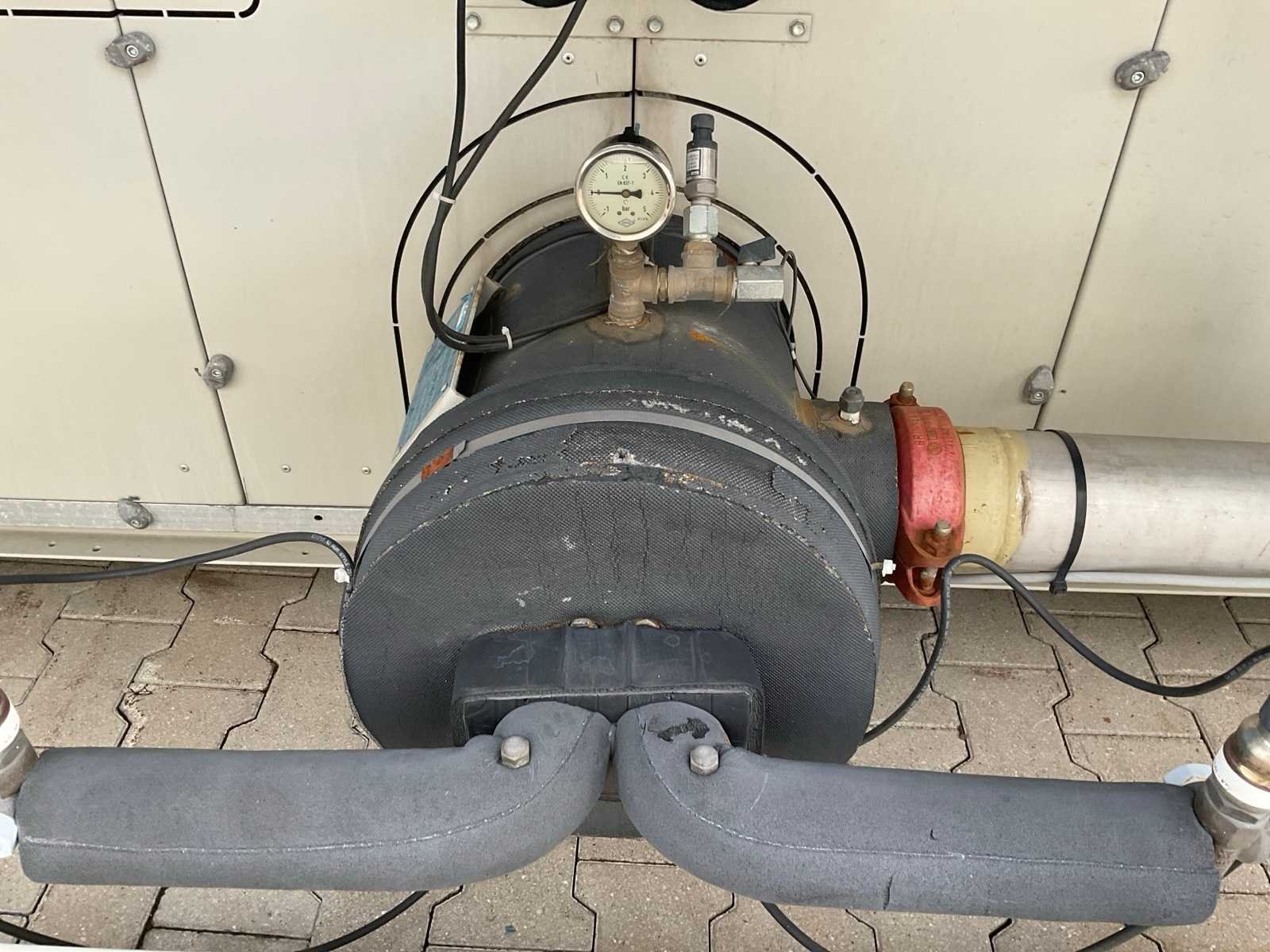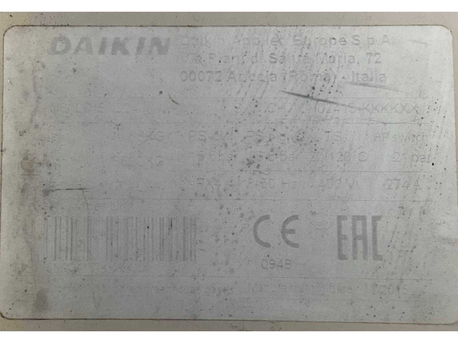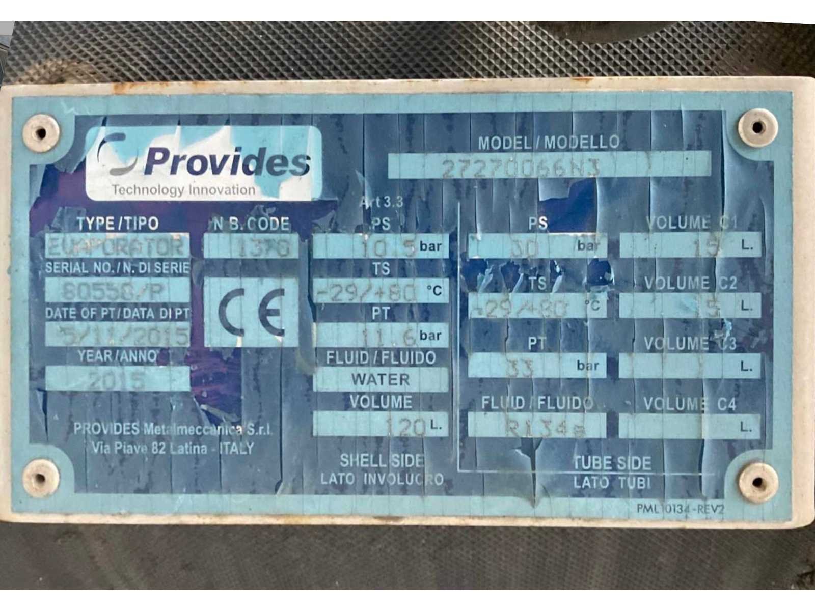 Buffervat 1500 liter, gemonteerd in gegalvaniseerd staal frame; voorzien van hijsogen en heftruck sleuven; max: -20 graden; 25,5 bar, 274 Alpère, working condition not verified; Merk: Daikin Aansluiting: 400V Eigen gewicht: 4800kg Type koudemiddel: R134a Totale afmeting Breedte: 2400mm Totale afmeting Hoogte: 2400mm Vermogen: 310kW Totale afmeting L: 5300mm Type: EWAD310D-SX0004 Bouwjaar: 2015